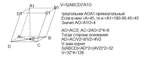 Основанием наклонной призмы АВСDA1B1C1D1 является квадрат. Вершина А1 проектируется в точку пересечения диагоналей основания призмы. Найдите объем призмы, если А1О=4см, а угол между боковым ребром АА1 и плоскостью основания равен 45.