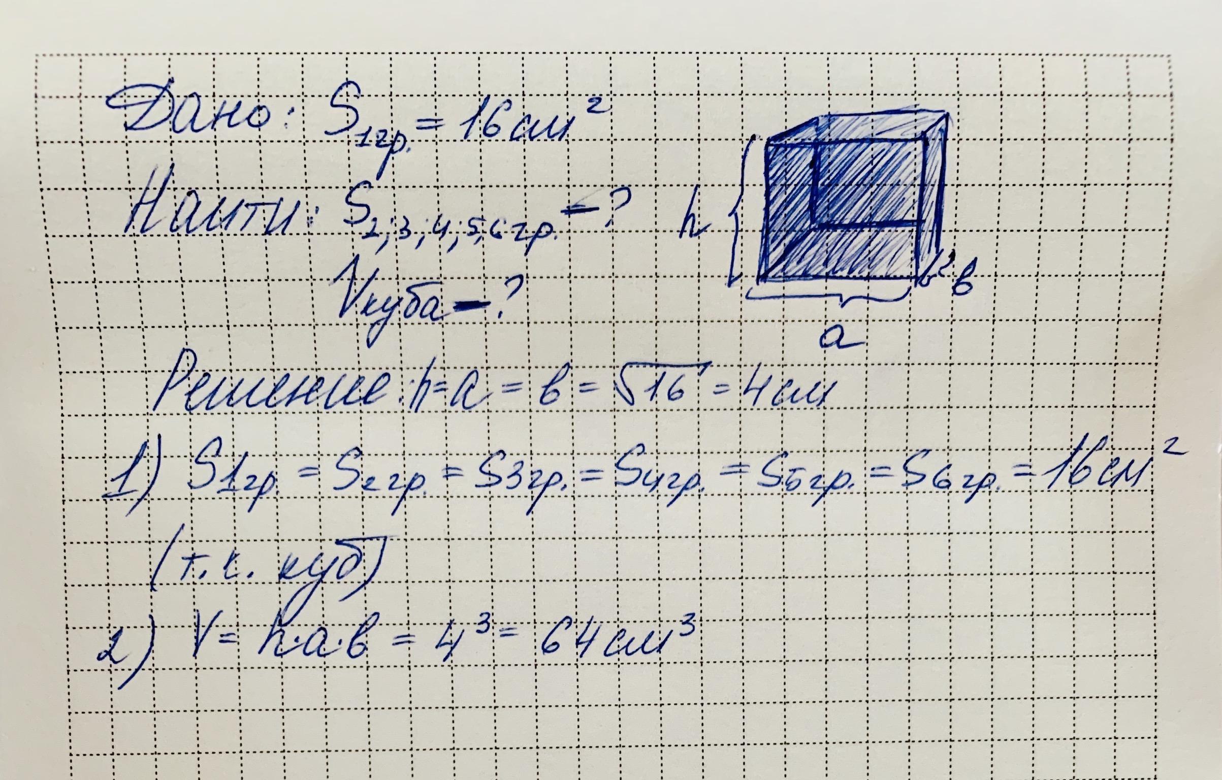 площадь одной грани куба равна 16 квадратных сантиметров Вычисли площадь других граней и объем куба