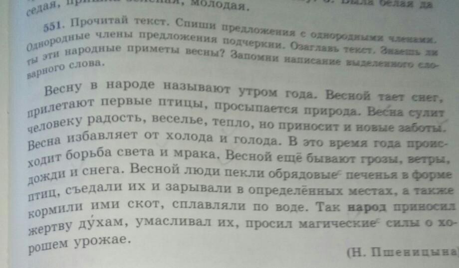 текст Спиши Предложения с однородными членами однородные члены предложения подчеркни Озаглавь текст Знаешь ли ты эти народные приметы весны Запомни написание выделенного словарного слова