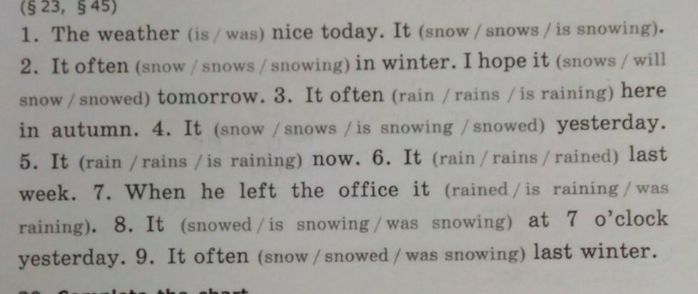 Was. Snows. Snowing. Will snow. Rain. Snowed. Is raining. Rains. Was raining. Snowed. Was snowing.
