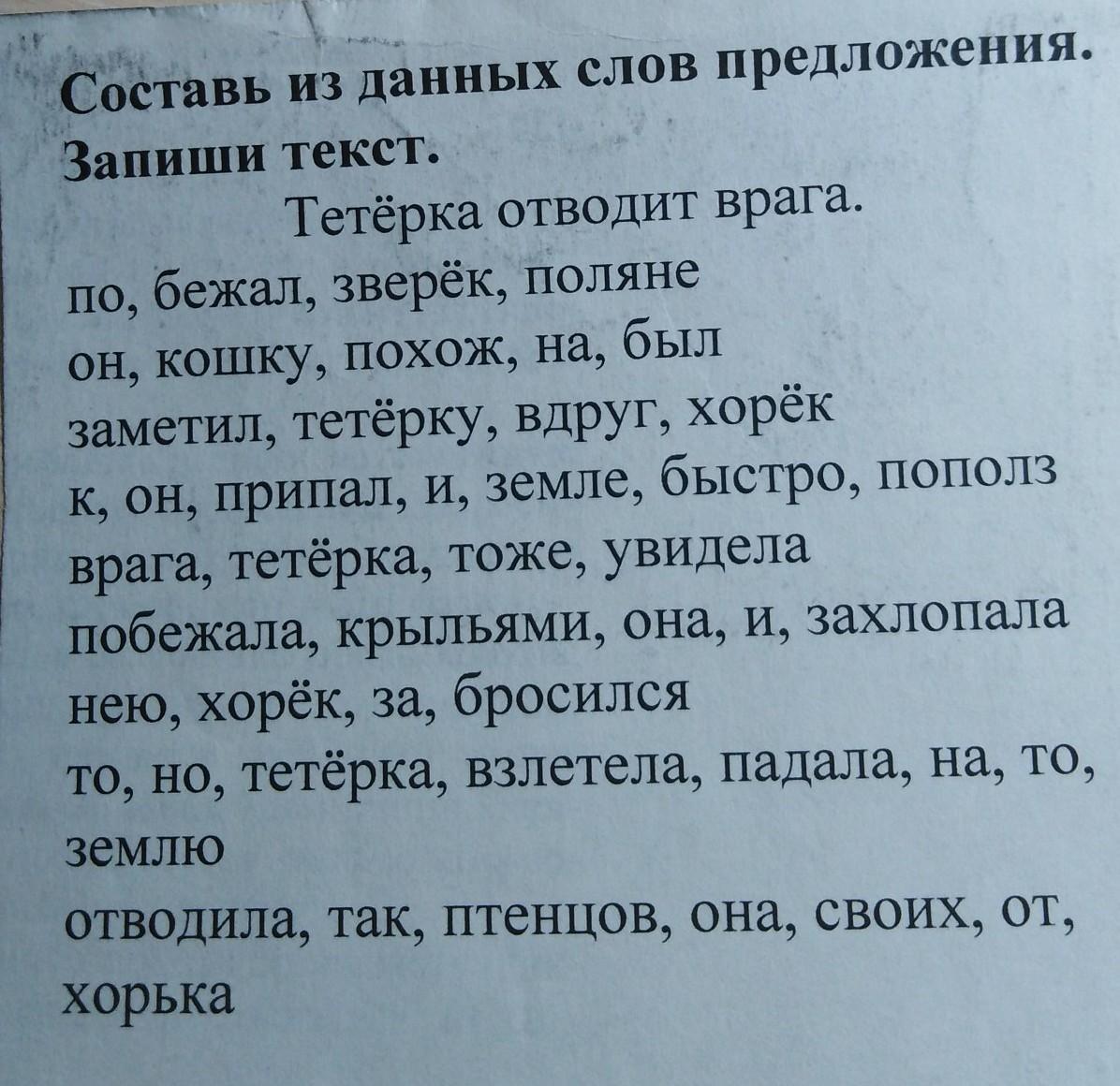 тетерка отводит врага. По поляне бежал зверек.Он был похож на кошку.Хорек вдруг заметил тетерку.Он быстро припал к земле и пополз. Тетерка тоже увидела врага. Она побежала и захлопала крыльями.Хорек бросился за нею. Но тетерка то взлетала, то падала на землю. Так она отводила хорька от своих птенцов.