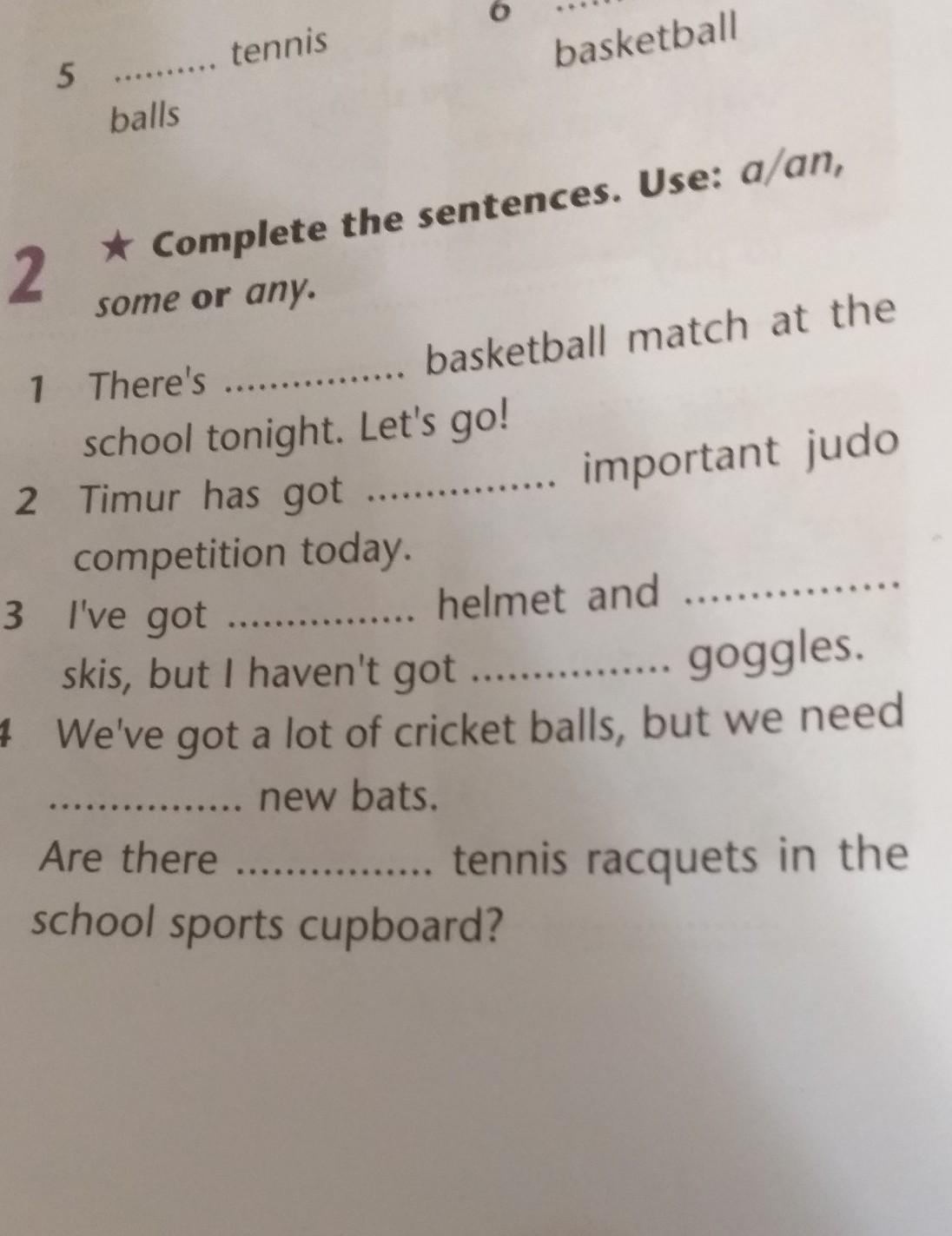 1) a, 2) an, 3) a,some, any 4) a, 5) any