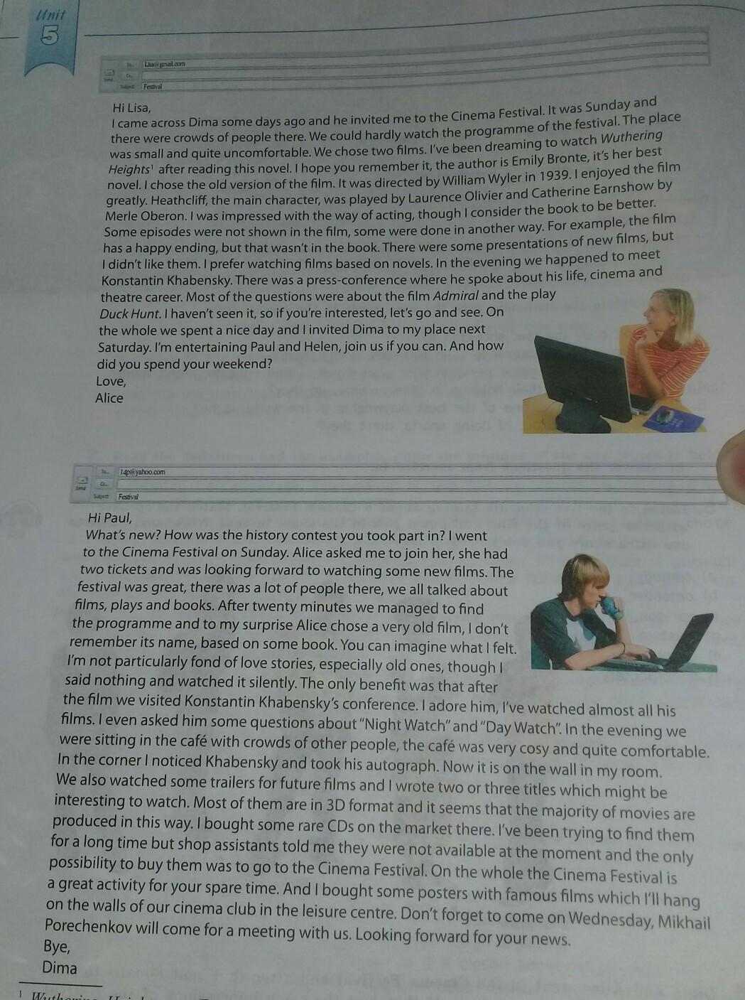 5 Привіт Ліза, натрапила на Діму кілька днів тому, і він запросив мене на кінофестиваль. Це була неділя і була маленькою і досить незручною. Ми вибрали два фільми. Я мріяв спостерігати за романом Вотхерінга. Я вибрав стару версію фільму. Його керував Вільям Мерль Оберон. Там були натовпи людей. Навряд чи можна було дивитися програму фестивалю. Місце читання цього роману. Я сподіваюся, ви пам'ятаєте його, автор Емілі Бронте, це її кращий Уайлер в 1939 році. книгу краще писоди не показували у фільмі, деякі робили по-іншому. Наприклад, фільм, але нових фільмів має щасливий кінець, але це не було в книзі. Були деякі презентації, які мені не подобалися. Я вважаю за краще дивитися фільми на основі романів. Увечері ми зустрілися з Костянтином Хабенським. Відбулася прес-конференція, на якій він розповів про свою життя, кіно і театральну кар'єру. Більшість запитань стосувалася фільму «Адмірал» і п'єси «Дак Хант». Я не бачила його, тому, якщо ви зацікавлені, давайте йти і подивитися. У цілому ми провели гарний день, і я запросив Діму на своє місце наступної суботи. Я розважаю Пол і Хелен, приєднуйся до нас, якщо зможеш. А як ви провели вихідні? Любов Аліса Привіт Пол, Що нового? Яким був конкурс історії, в якому ви брали участь? У неділю я пішов на кінофестиваль. Аліса попросила мене приєднатися до неї, вона мала два квитки і з нетерпінням чекала нових фільмів. Фестиваль був великим, там було багато людей, ми всі говорили про фільми, п'єси та книги. Через двадцять хвилин нам вдалося знайти програму, і, на моє здивування, Аліса вибрала дуже старий фільм, я не пам'ятаю його назви на основі якоїсь книги. Можна собі уявити, що я відчував. Я не дуже люблю історії кохання, особливо старі, хоча нічого не сказали і мовчки дивилися. Єдиною вигодою було те, що після фільму ми відвідали конференцію Костянтина Хабенського. Я обожнюю його, спостерігав, як майже всі сиділи в кафе з натовпами інших людей, кафе було дуже затишно і комфортно. У кутку помітив Хабенського і взяв його автограф. Тепер вона знаходиться на стіні в моїй кімнаті. Ми також дивилися деякі трейлери для майбутніх фільмів, і я написав два або три назви, які могли б бути цікаві для перегляду. Більшість з них в 3D-форматі, і здається, що більшість фільмів виробляються таким чином. Я купив деякі рідкісні компакт-диски на ринку там. Я довго намагався знайти то, але продавці сказали, що їх зараз немає і єдиною можливістю їх придбати є поїхати на кінофестиваль. Загалом, кінофестиваль - це велика активність для вашого вільного часу. І я купив кілька плакатів з відомими фільмами, які вішатимуть на стінах нашого кінотеатру в центрі дозвілля. Не забудьте приїхати в середу, Михайло en запитав у нього кілька запитань про "Нічний дозор" і "Денний дозор: увечері ми з Пореченковим приїдемо на зустріч з нами.