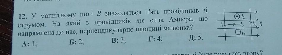 У магнітному полі В знаходяться 5 провідників зі струмом. На який з провідників діє сила Ампера, що напрямлена до нас перпендикулярно площині малюнка?