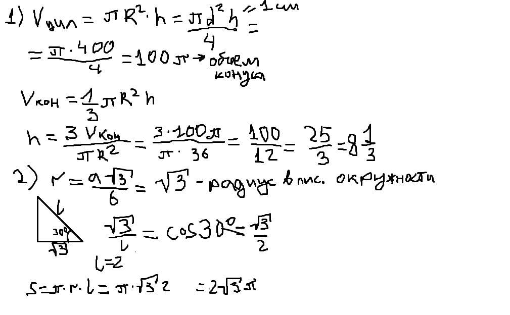 1) В цилиндрический сосуд с водой и диаметром 20 см, поместили конусовидную деталь, радиус основания которой 6 см(Деталь полностью погружена в воду). Уровень воды поднялся на 1 см. Вычислите высоту детали.
