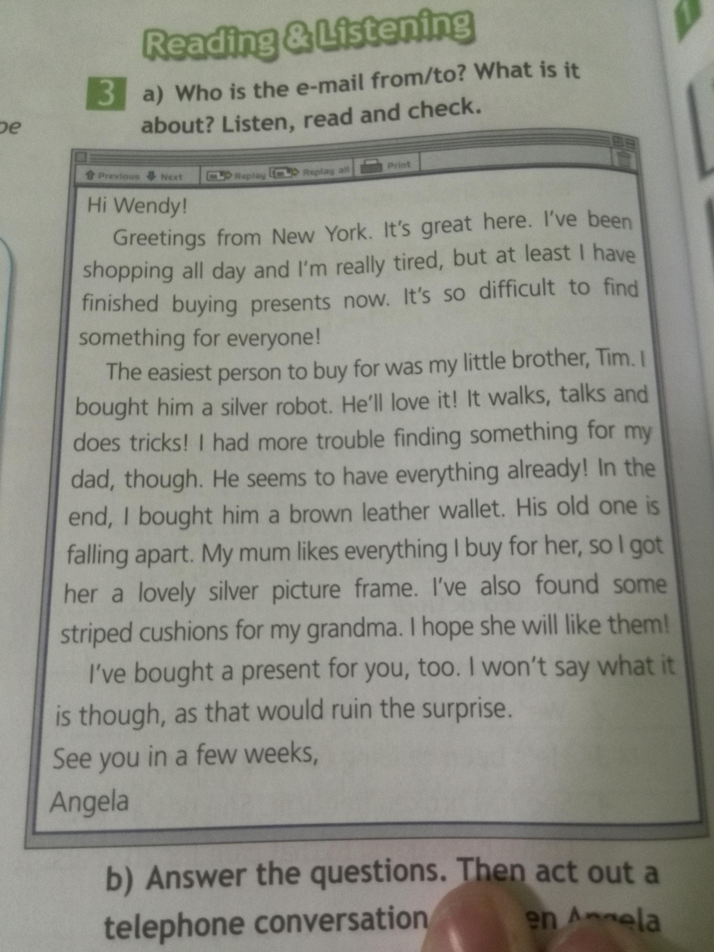 Привет из Нью-Йорка. Здесь здорово. Я весь день ходил по магазинам и очень устал, но, по крайней мере, я уже закончил покупать подарки. Так сложно найти что-то для всех! Самым простым человеком, за которого можно было купить, был мой младший брат Тим. Я купил ему серебряного робота. Он будет любить это! Он ходит, говорит и делает трюки! У меня было больше проблем, чтобы найти что-то для моего отца, хотя. Кажется, у него уже есть все! В итоге я купил ему коричневый кожаный кошелек. Его старый разваливается. Моей маме нравится все, что я покупаю для нее, поэтому я подарил ей прекрасную серебряную рамку для фотографий. Я также нашел полосатые подушки для моей бабушки. Надеюсь, она мне понравится. Я тоже купила для тебя подарок. Я не буду говорить, что это такое, потому что это испортит сюрприз. Увидимся через несколько недель, Анжела