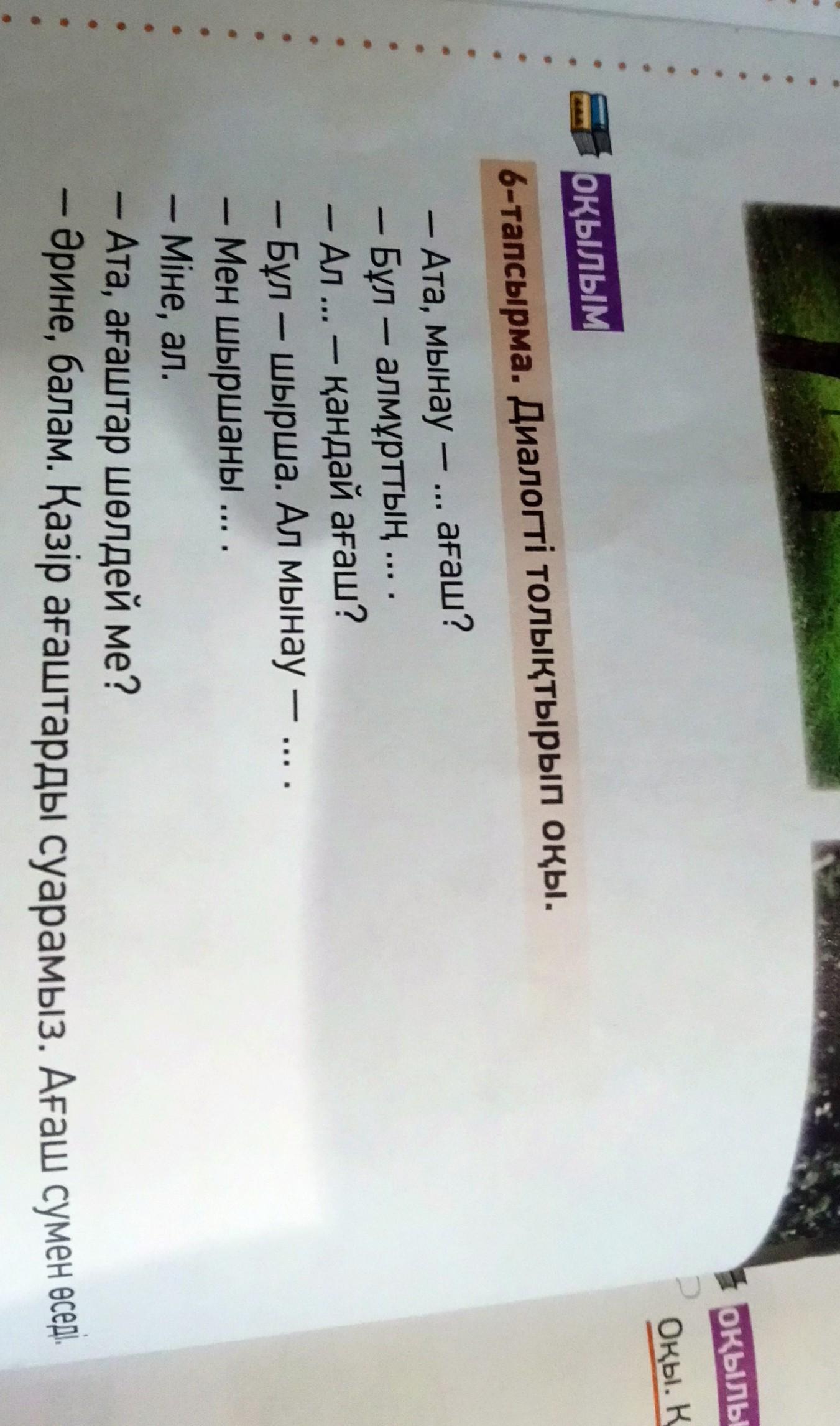Ата мынау қандай агаш бул алмурттын агашы Ал мынау кандай агаш бул шырша.Ал мынау кызкалдак Мен шыршаны кушти коремин мине ал Ата агаштар шолдейме Әрине балам. осы болды!