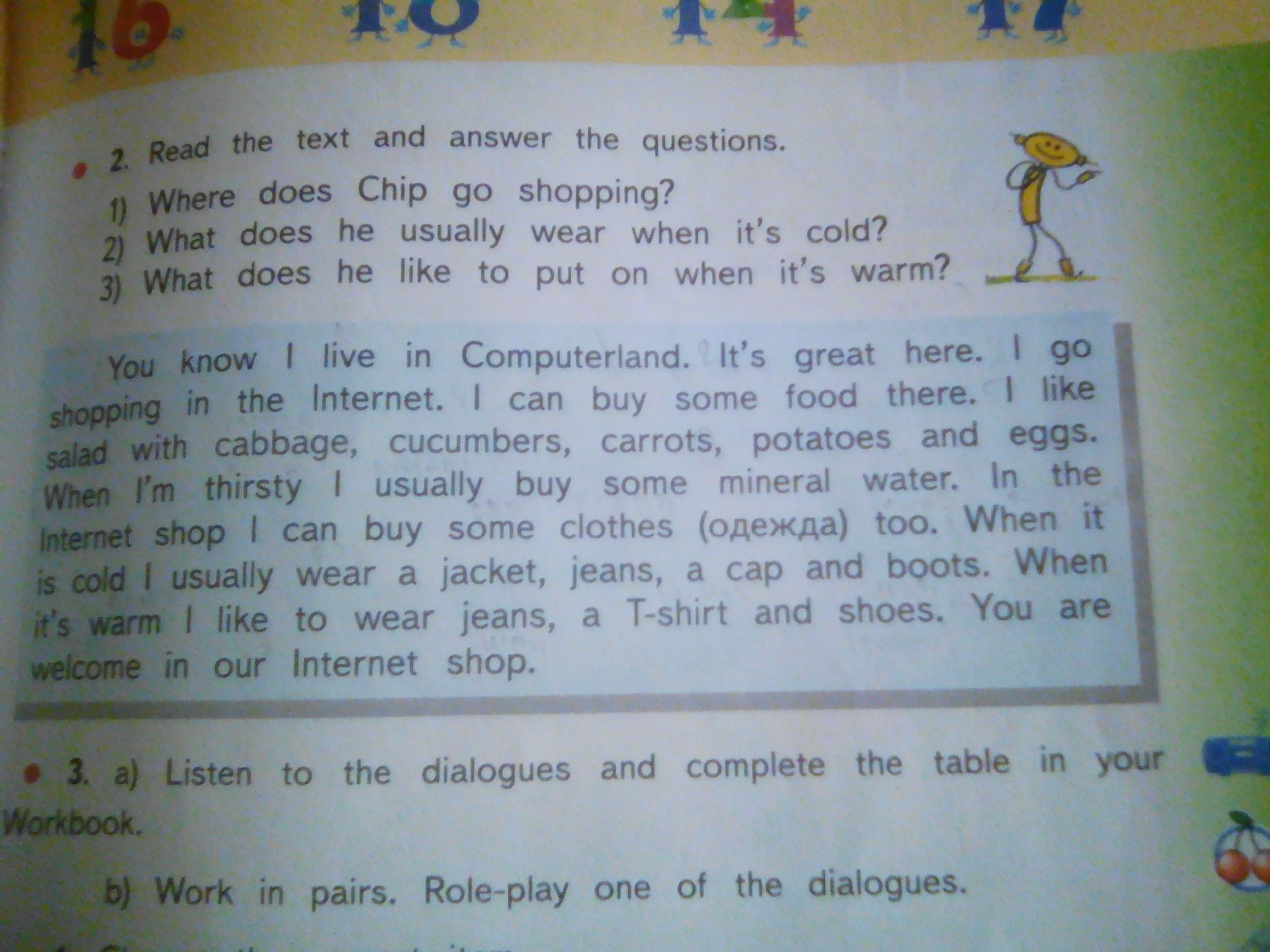 Ты знаешь, что я живу в компьютерном мире. Здесь хорошо. Я делаю покупки в интернете. Я могу купить некоторую еду здесь. Мне нравится салат с капустой, огурцами, морковью, картофелем и яйцами. Когда я хочу пить, я обычно покупаю минеральную воду. В интернет магазине я могу купить некоторую одежду тоже. Когда холодно, я обычно надеваю куртку, джинсы, шапку и ботинки. Когда жарко, я люблю носить джинсы, футболку, и кроссовки. Добро пожаловать в наш интернет магазин.