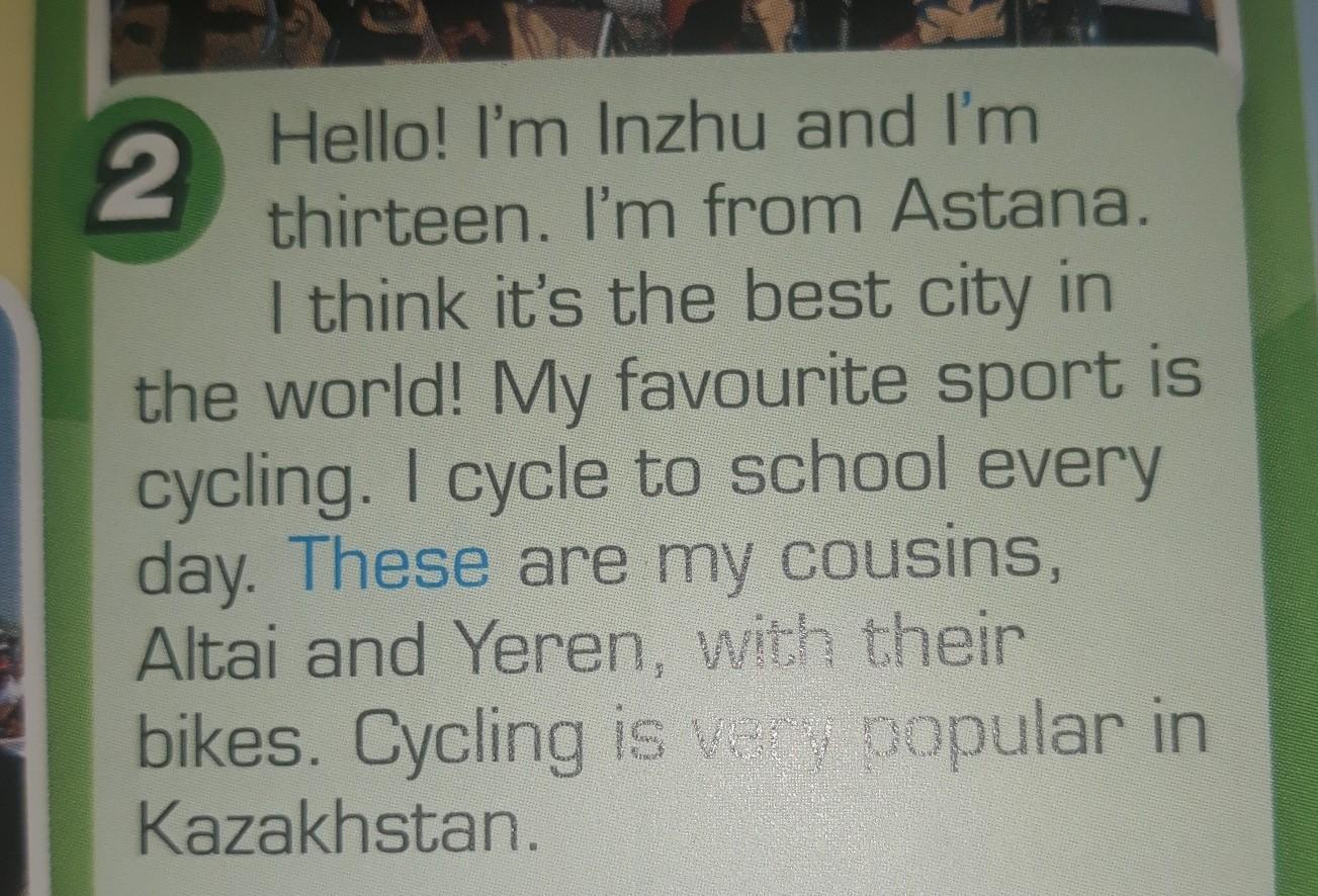 Здравствуйте! Я Инжу и мне тринадцать. Я из Астаны. Я думаю, что это лучший город в мире! Мой любимый вид спорта - езда на велосипеде. Я езжу в школу каждый день. Это мои двоюродные братья, Алтай и Ерен, со своими велосипедами. Велоспорт очень популярен в Казахстане.