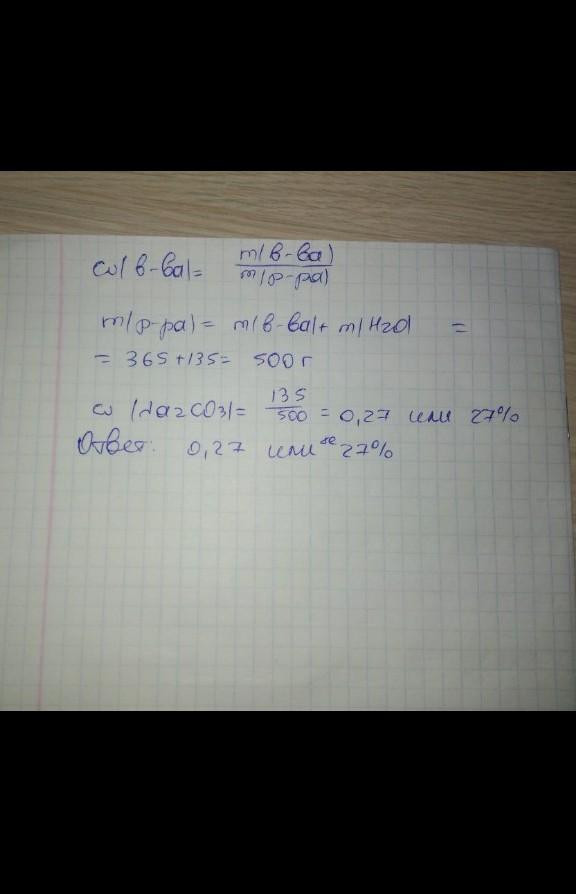 В 365 г воды растворили 135 г кристаллической соды, определите массовую долю( в долях еденицы и процентах) безводной соли( Na2CO3) в полученном растворе