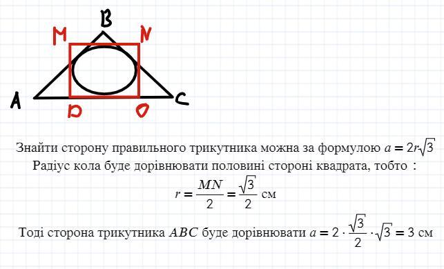 навколо кола описані правильний трикутник і квадрат. знайти сторону трикутника якщо сторона квадрата √3 см. Бажано розв'язання з малюнком