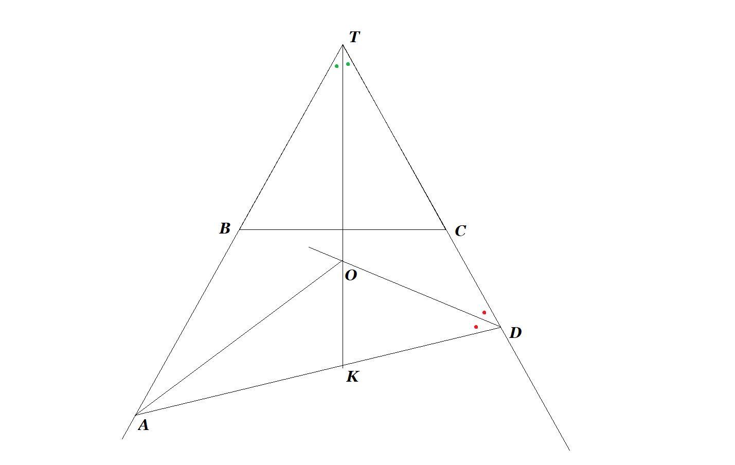 Заметим, что TK - биссектриса угла T; DO - биссектриса угла D; Биссектрисы треугольника TAD пересекаются в одной точке, стало быть AO - также биссектриса.