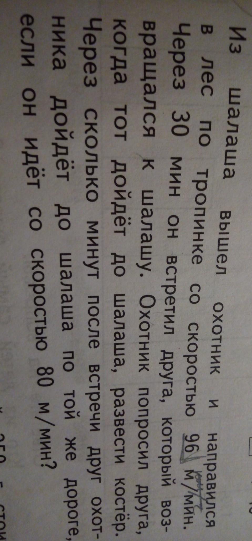 96 • 30 = 2880 (м) — прошёл охотник. 2) 2880 : 80 = 36 (мин)