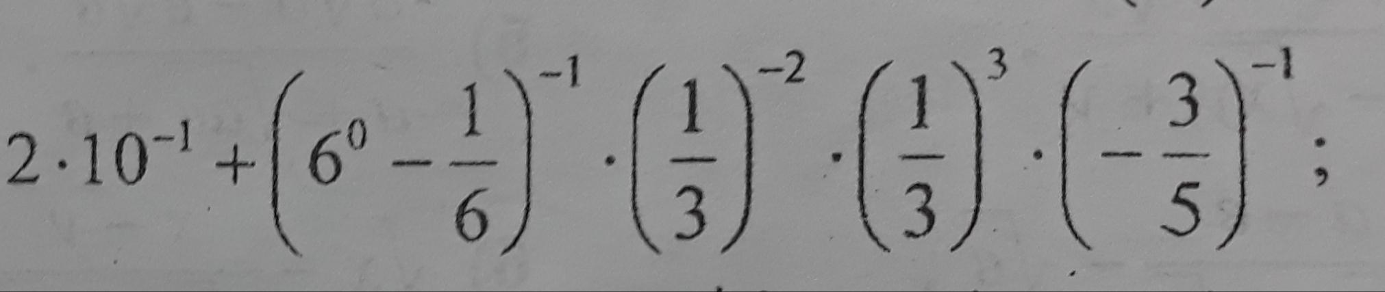 = 2 times  frac{1}{10}  +  {(1 -  frac{1}{6}) }^{ - 1}  times   {3}^{2}  times  frac{1}{27}  times ( -  frac{5}{3} ) =  \  =  frac{1}{5}  +  frac{6}{5}  times  frac{1}{3}  times ( -  frac{5}{3} ) =  \  =  frac{1}{5}   -  frac{2}{3}  =  frac{3 - 10}{15}  =  -  frac{7}{10}  =  - 0.7