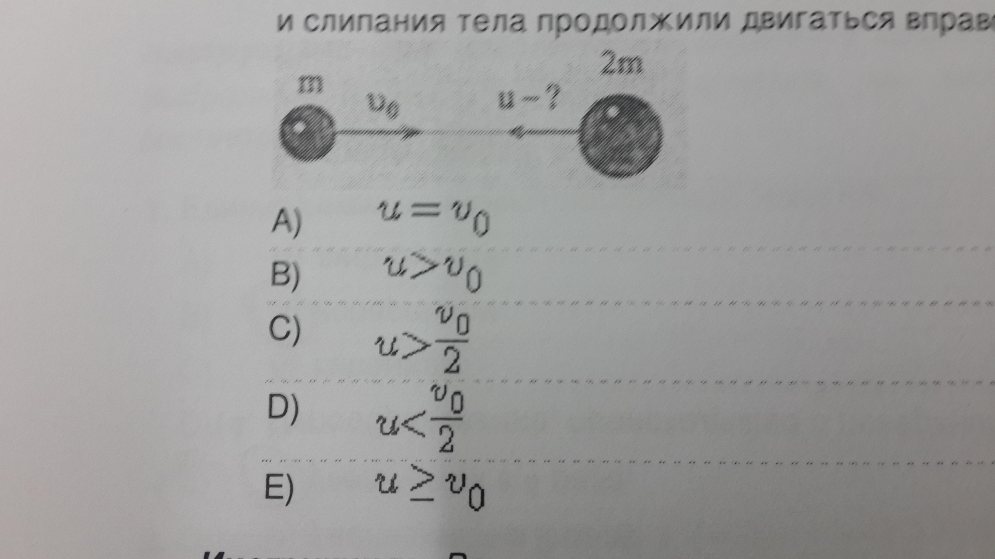 Два тела движутся навстречу друг другу так, как показано на рисунке. Чтобы после соударения и слипания тела продолжили двигатьсч вправо, модуль скорости u второго тела должен быть