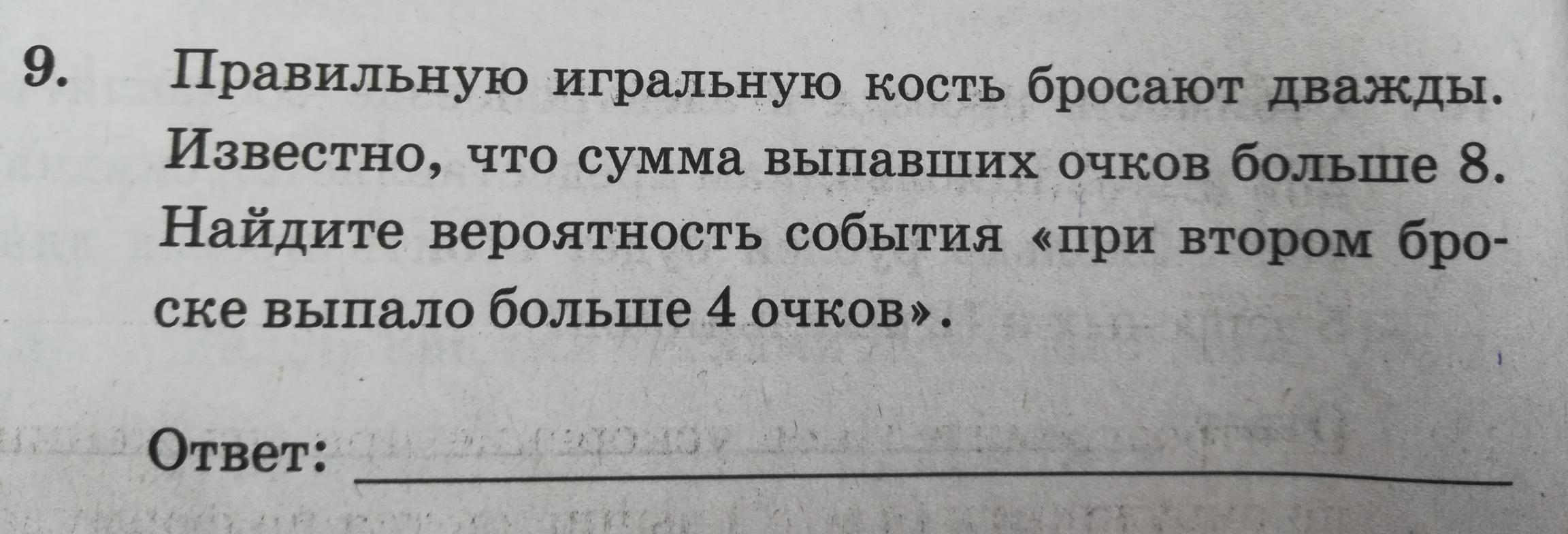 Исходов двух бросков,сумма которых больше 8(3;6,4;5,4;6,5;4,5;5,5;6,6;3,6;4,6;5,6;6)