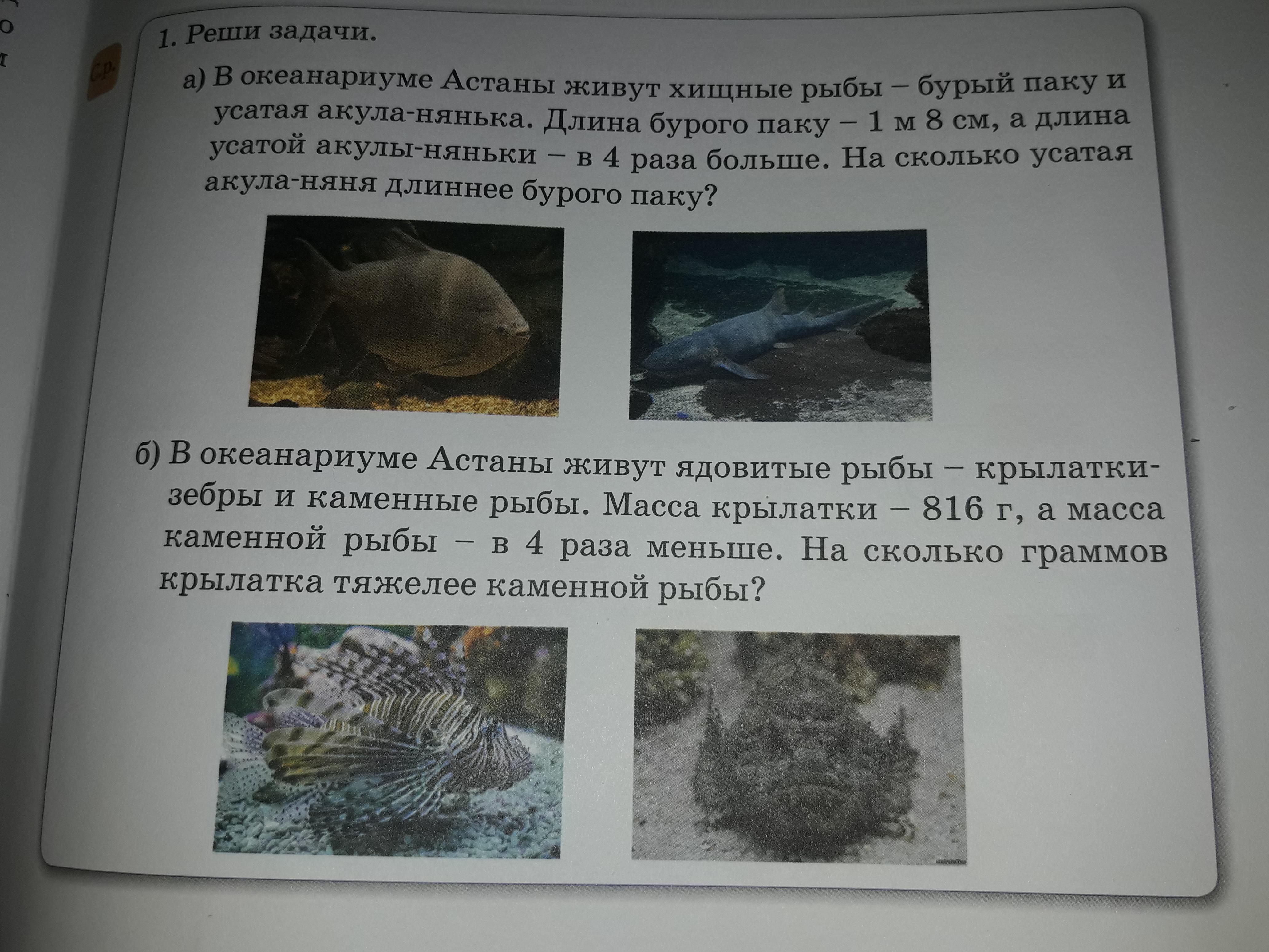 2 действие 4032-1008=3024 см разница. Ответ: усатая акула нянька длиннее бурого Паку на 3024 сантиметра.