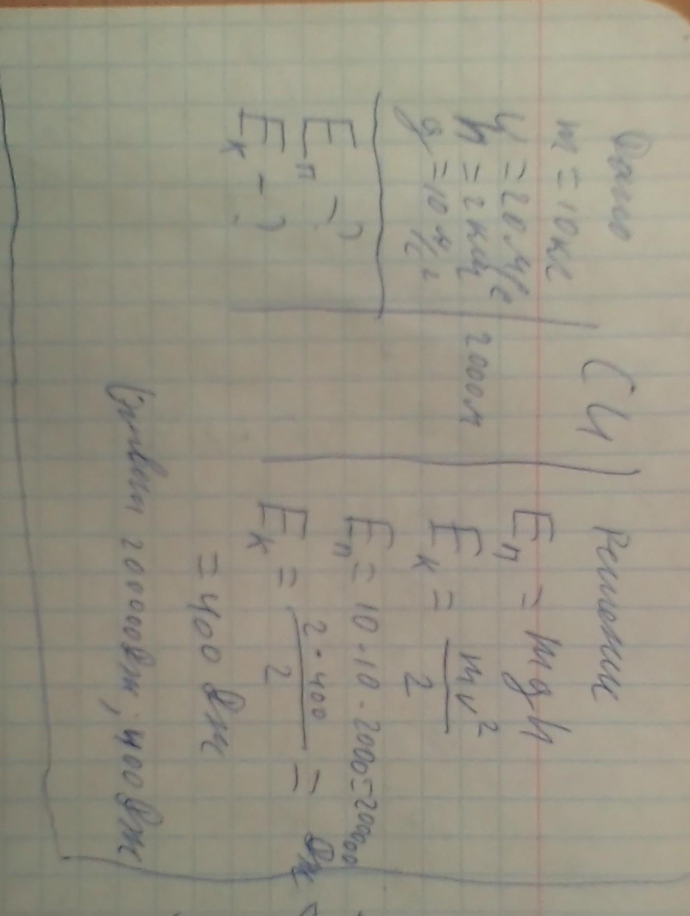 снаряд массой 10 кг движется со скоростью 20 м/с на высоте 2 км. Вычислите потенциальную и кинетическую энергию , которой обладает снаряд?