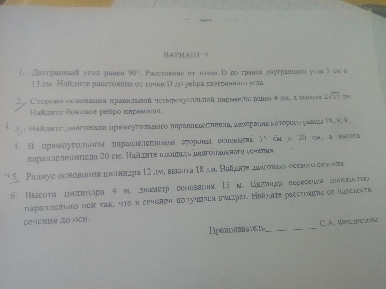 1. Двугранный угол равен 90°. Расстояние от точки D до граней двугранного угла 3 см и 15 см. Найдите расстояние от точки D до ребра двугранного угла.