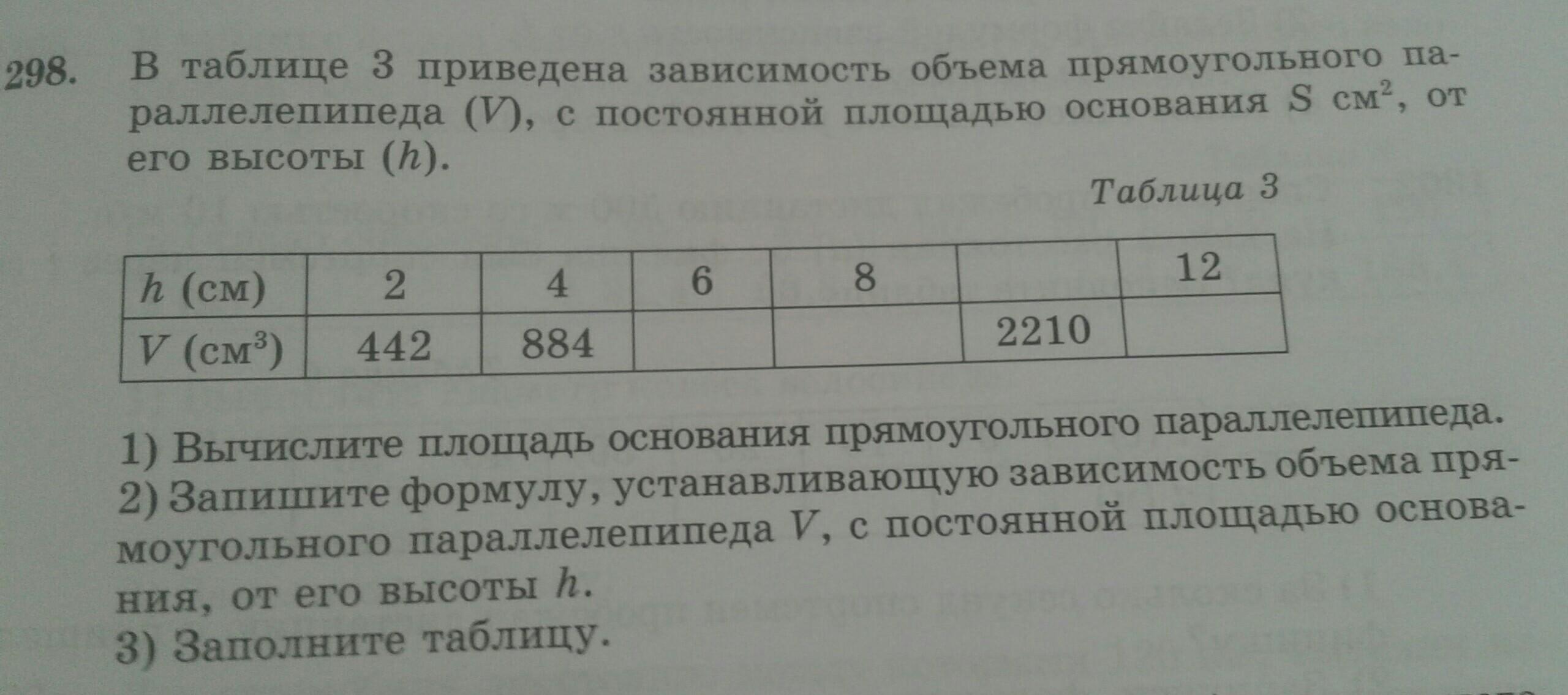 В таблице 3 приведена зависимость объема прямоугольного параллелепипеда (V, с постоянной площадью основания S см, от его высоты (h)