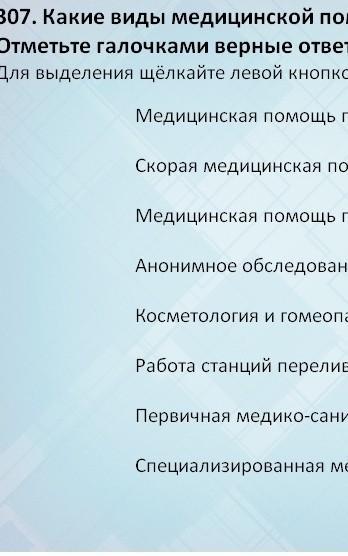 1. Первичная медико-санитарная помощь. Оказывается фельдшерами, акушерами и другими медработниками со средним медицинским образованием; врачами-терапевтами, врачами-педиатрами, в том числе участковыми врачами, врачами общей практики и врачами-специалистами.