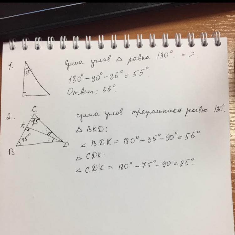 (15 БАЛЛОВ!!!) 1.Найдите острый угол прямоугольного треугольника , если другой острый угол равен 35 градусов. 2.В треугольнике ВДС проведена высота ДК. Найдите углы треугольников ВДК и СДК , если в треугольнике ВДС угол В= 35 градусов, угол С =75 градусов.