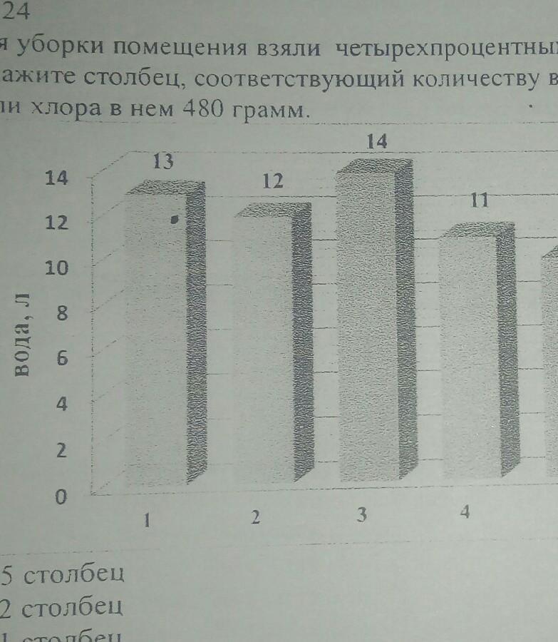 для уборки помещения взяли четырёхпроцентный хлорированный раствор . Укажите столбец , соответствующий количеству воды в данном растворе , если хлора в нём 480 грамм