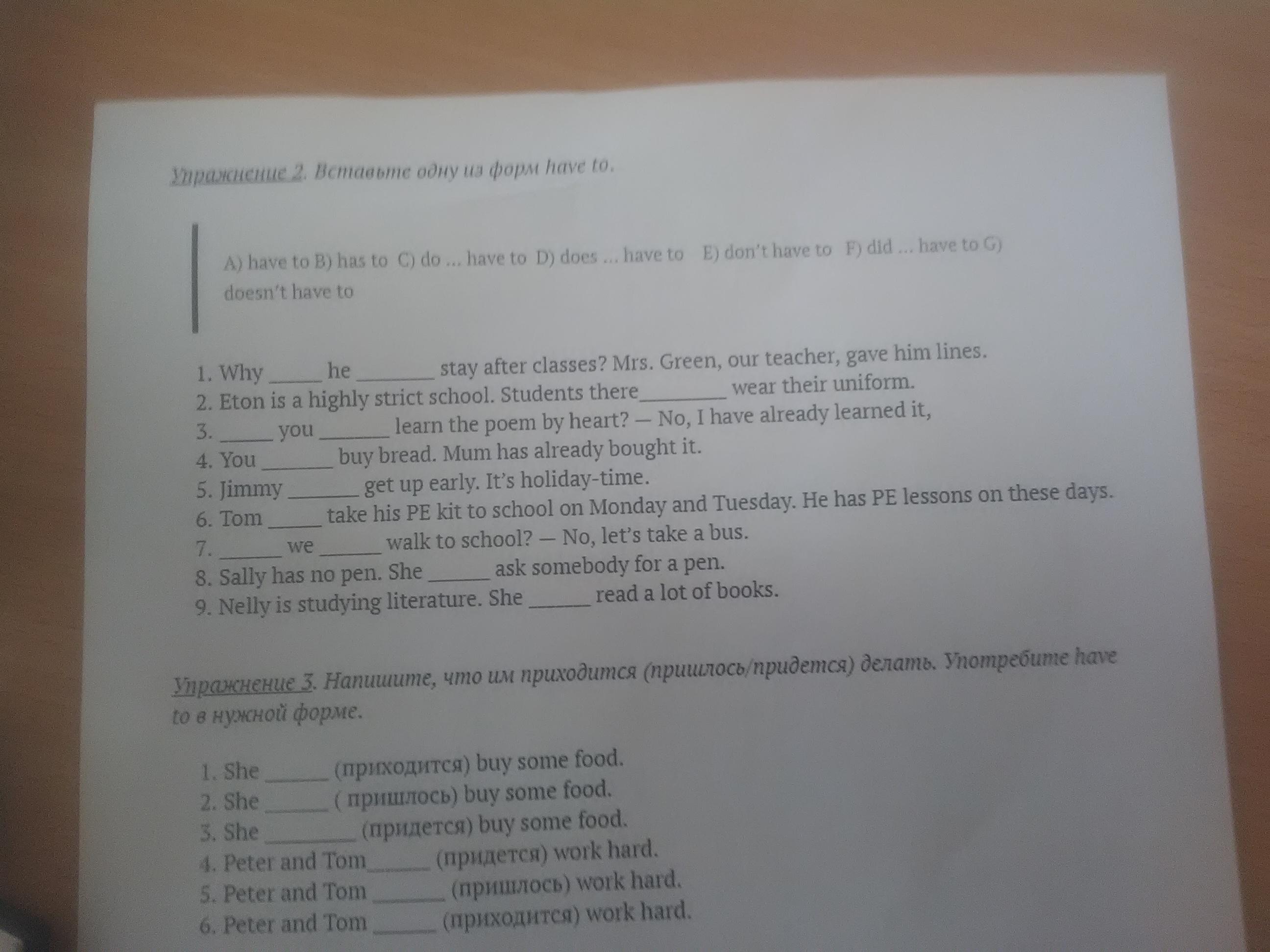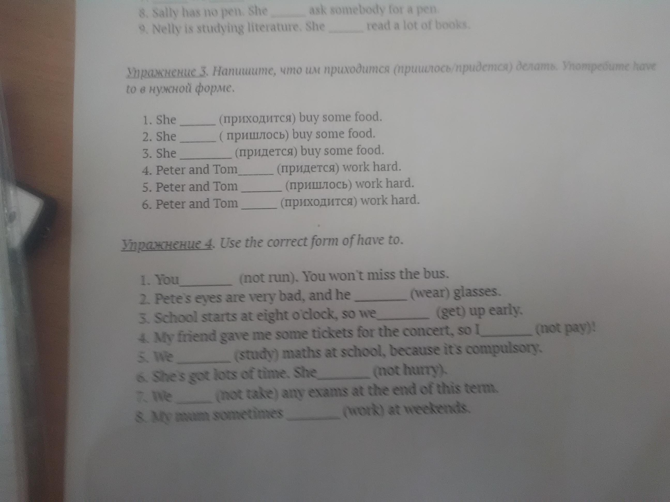 1)she have to buy some food.2)she had to buy some food.3)she have to buy some food.4)Peter and Tom have to work hard.5)Peter and Tom had to work hard.6)Peter and Tom have to work hard