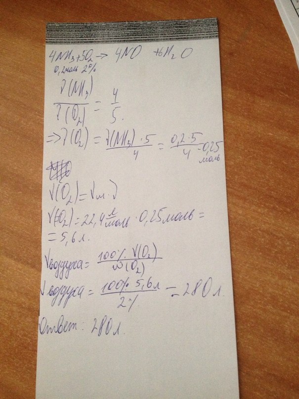 На каталитическое окисление аммиака количеством вещества 0,2 моль затратится воздух (н.у),содержащий 2% кислорода,объемом: