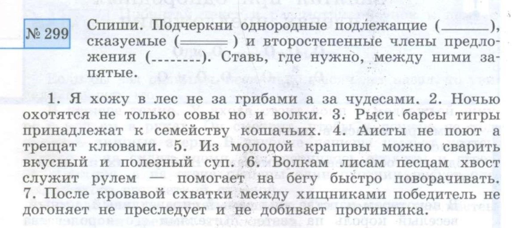 Я хожу(сказуемое) в лес(подлежащее) не за грибами, а за чудесами.2 Ночью охотятся(сказуемое) не только совы(подлежащее), но и волки(подлежащее). 3 Рыси(подлежащее),барсы(подлежащее), тигры(подлежащее) принадлежат(сказуемое) к семейству кошачьих. 4 Аисты(подлежащее) не поют(сказуемое), а трещат(сказуемое) клювами. 5 Из молодой(второстепенный) крапивы можно сварить(сказуемое) вкусный(второстепенный) и полезный(второстепенный) суп(подлежащее). 6 Волкам(подлежащее), лисам(подлежащее), песцам(подлежащее) хвост служит рулём - помогает(сказуемое) на бегу быстро поворачивать(сказуемое). 7 После кровавой(второстепенный) схватки между хищниками победитель(подлежащее) не догоняеет(сказуемое), не преследует(сказуемое) и не добивает(сказуемое) противника.