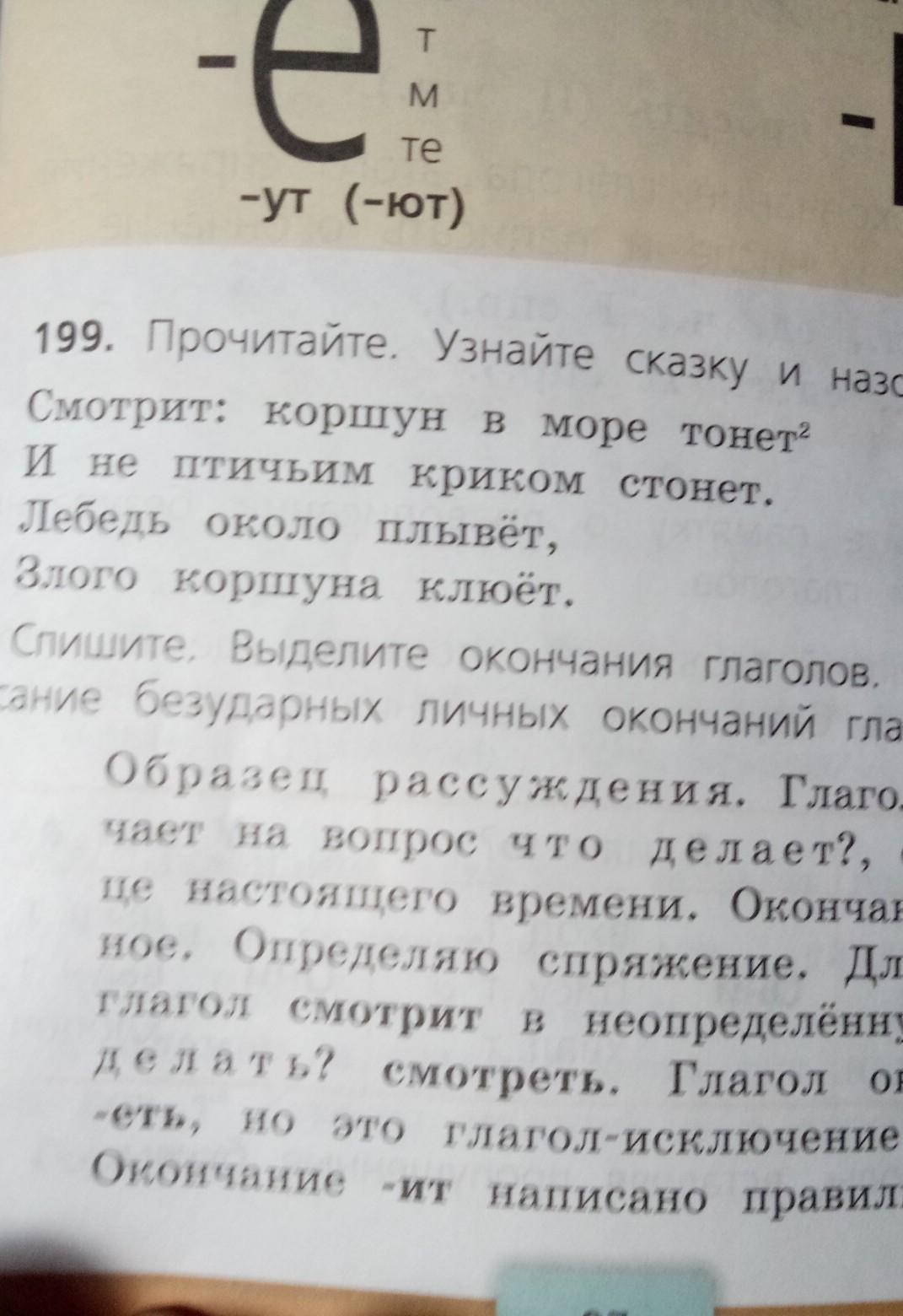Прочитайте. Узнайте сказку и назовите её автора. Смотрит: коршун в море тонет2 И не птичьим криком стонет. Лебедь около плывёт, Злого коршуна клюёт. Спишите. Выделите окончания глаголов. Обоснуйте правописание безударных личных окончаний глаголов.
