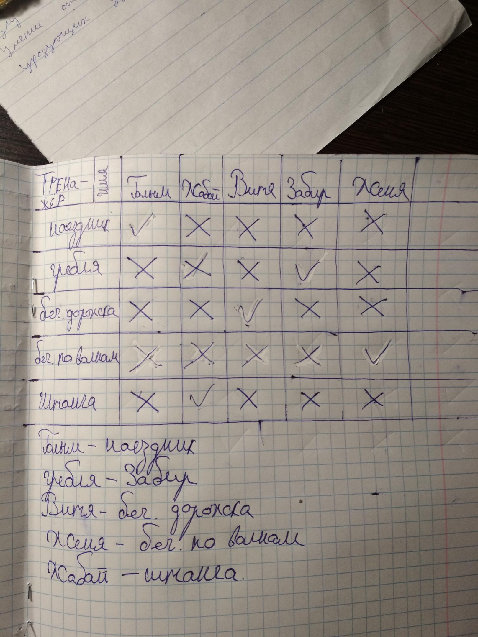 У Галыма ,Жабая,Вити,Забира, Жени Есть по одному детскому тренажеру.Одного из них есть тренажер наездник, у другого гребля,У третьего беговая дорожка, у четвёртого бегущая по волнам, у пятого скамья со штангой. Тренажер наездник и беговая дорожка ни у Жабая,не у Забира,не у Жени .У Галыма не гребля ,не беговая дорожка,не скамья со штангой.У Вити не наездник ,не гребля ,не скамья со штангой.Тренажёр скамья со штангой не у Забира и не у Жени. Тренажёр гребля не у Жени . Какой тренажёр у Галыма,Жабая,Вити,Забира,Жени? Помогите пожалуйста пожалуйста пожалуйста по математике срочно нужно!!!