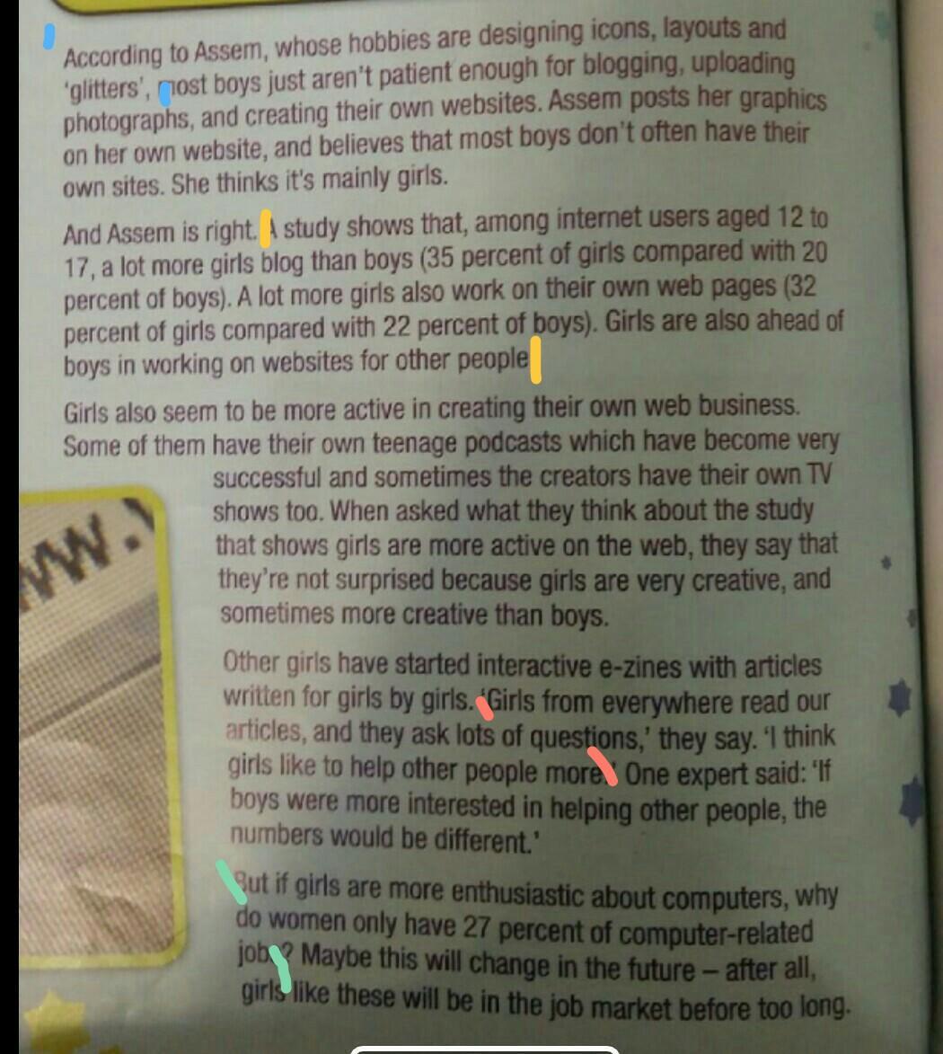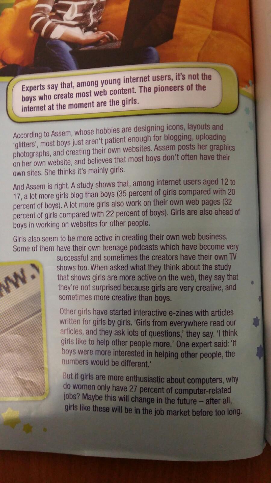 1. Whu does Assem think boys don't create web content ?