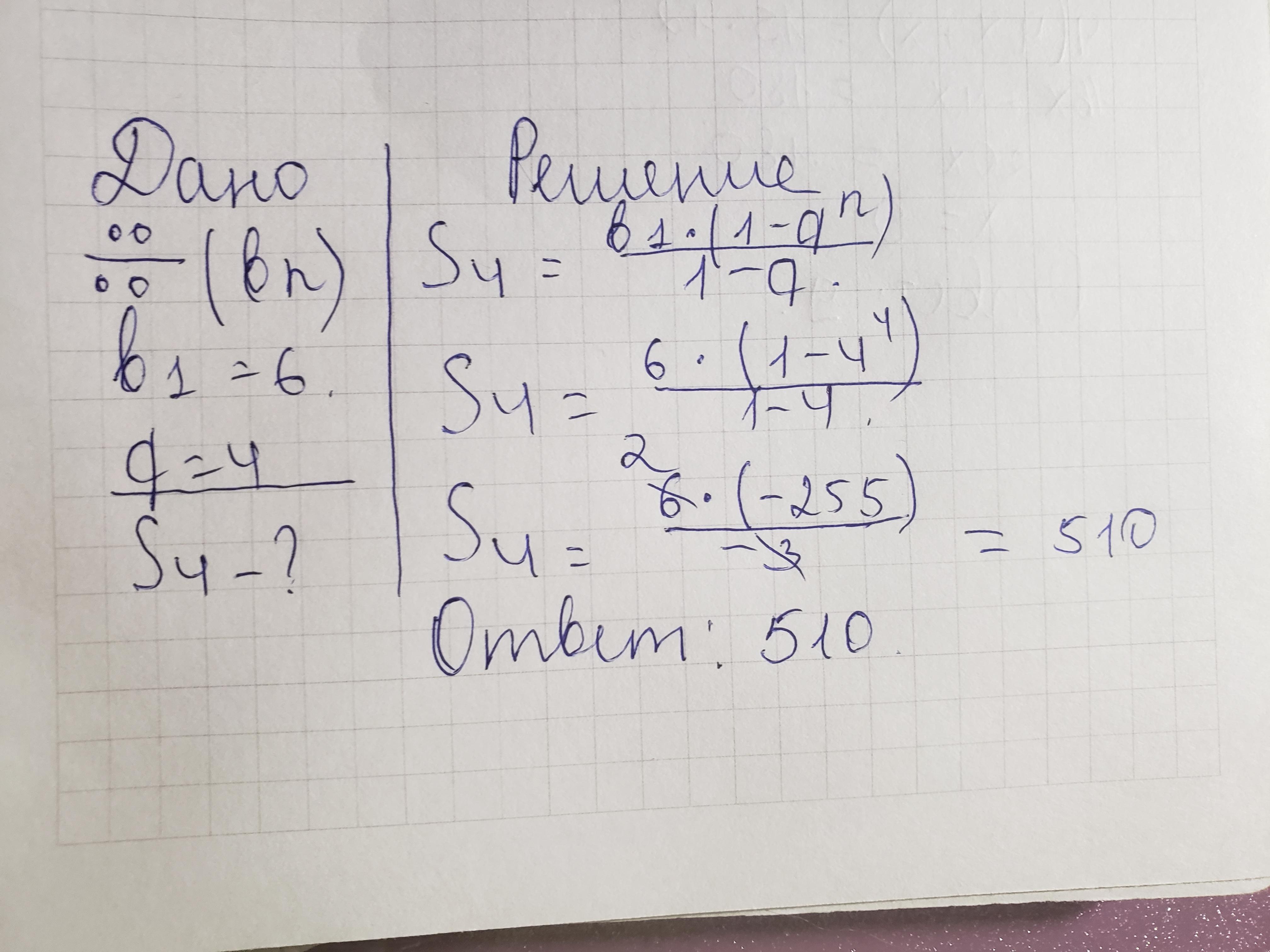 Найди сумму первых 4 членов геометрической прогрессии, если b1 = 6 и q= 4.