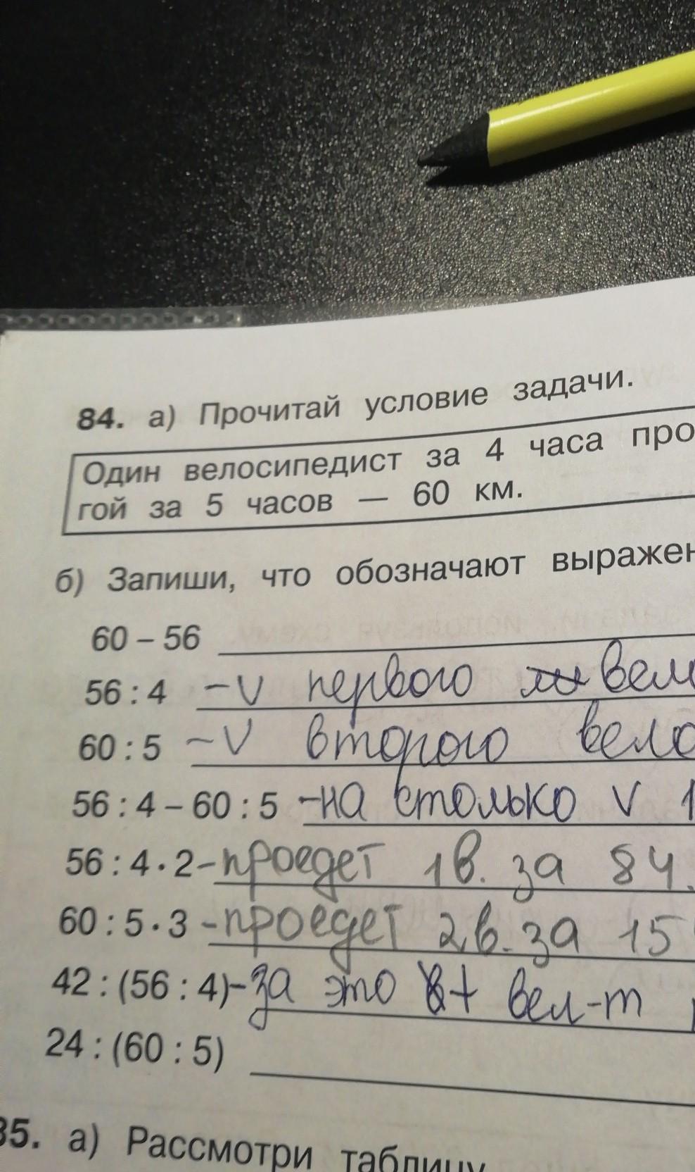Один велосипедист за 4 часа проехал 56 км а другой за 5 часов 60 км Запиши Что обозначают выражения которые на фото