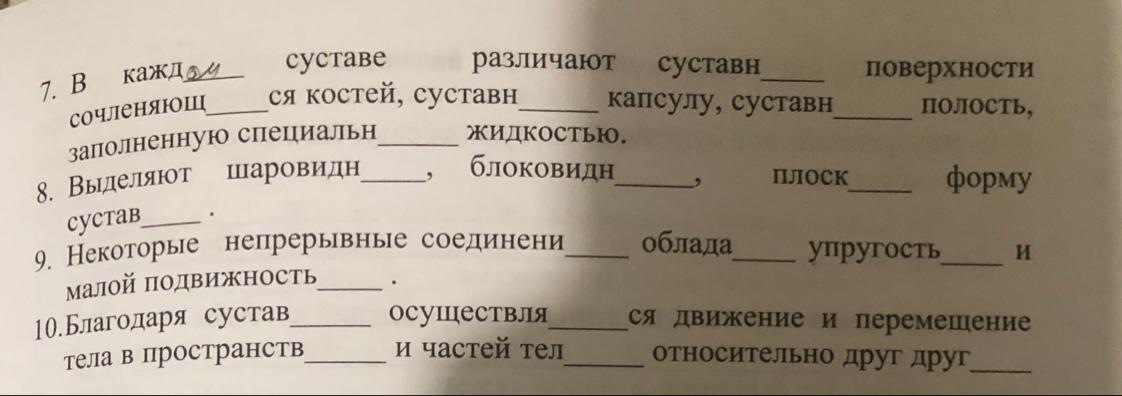 7.в каждом суставе,суставные поверхности,сочленяющихся костей,суставную капсулу,суставную полость,специальной жидкостью,