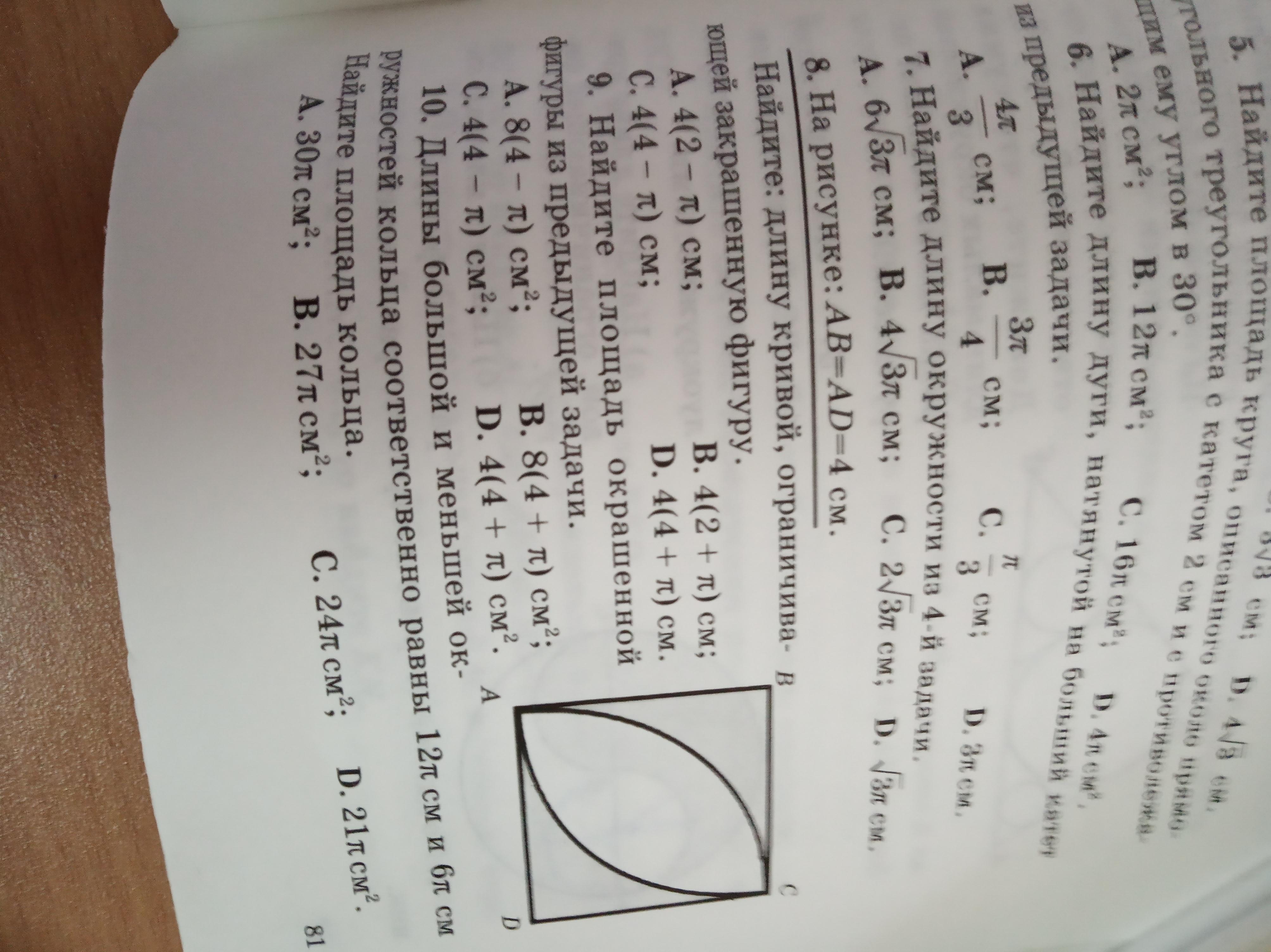 АВ=АД=4см -радиусы кривых, тогда они равны 2πR/4=πR/2, длина 2х сторон квадрата 2R, общая длина для 2х фигур πR+4R=R(π+4)=4(4+π) см² -ответ D