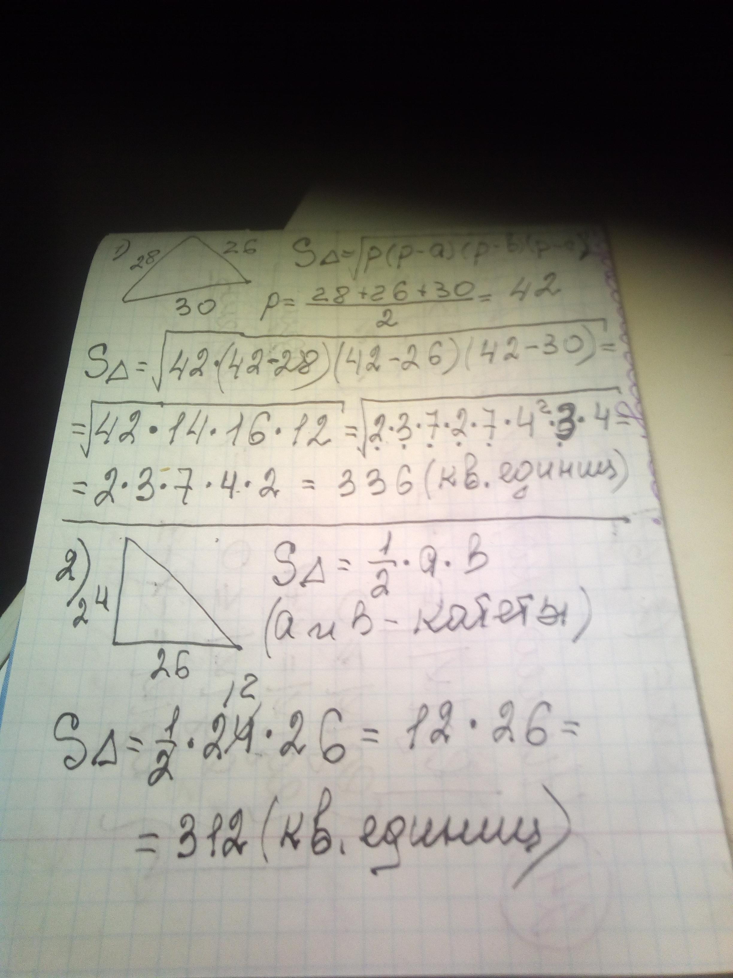 Найдите площадь треугольника, если его стороны равны: а = 28, b =2 6, с = 30; и найдите площадь прямоугольного треугольника, если его катеты равны 24 см и 26 см