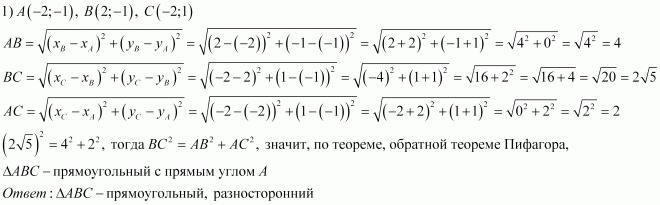определите вид треугольника АВС если его вершины имеют координаты а) А(-2;-1) В(2:-1) С(-2:1). б) А(-2;-2) В(2;-2) С(0;1)