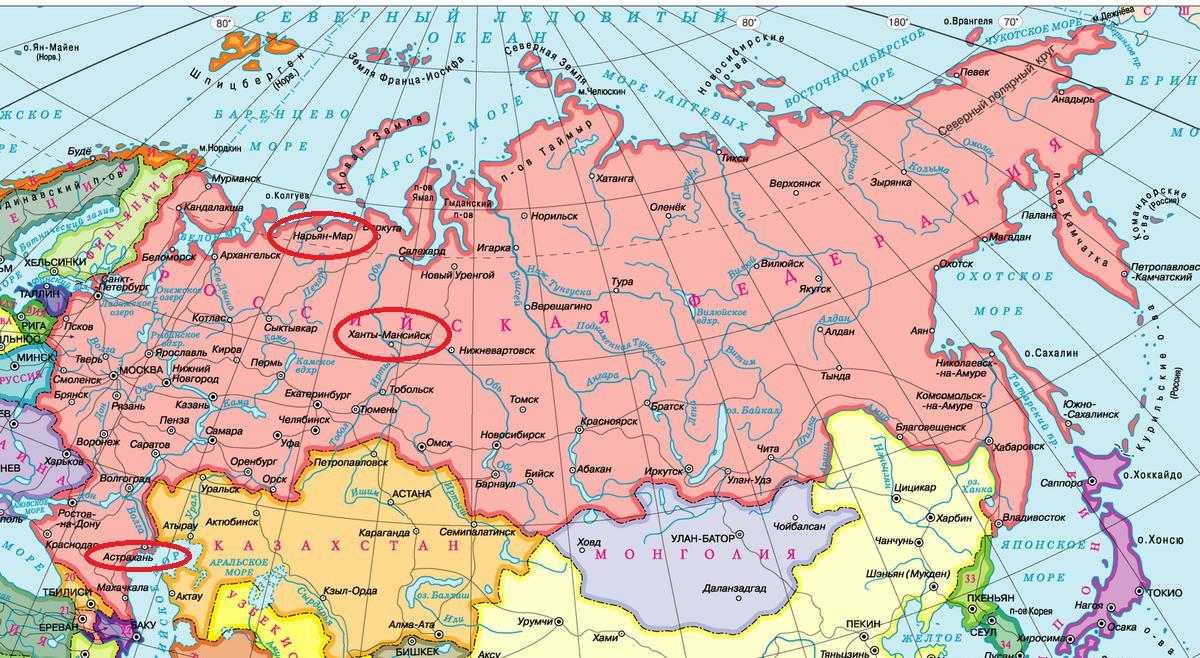 При воздействии солнечного света на кожу человека в его организме вырабатывается витамин D, имеющий большое значение для костных тканей и иммунной системы человека. Недостаток солнечного света может привести к снижению содержания витамина D в организме и, как следствие, к снижению защитных свойств иммунной системы. Запишите перечисленные города России в порядке увеличения продолжительности времени воздействия солнечного света 12 декабря, начиная с города с наименьшей продолжительностью этого времени. Астрахань Нарьян-Мар Ханты-Мансийск