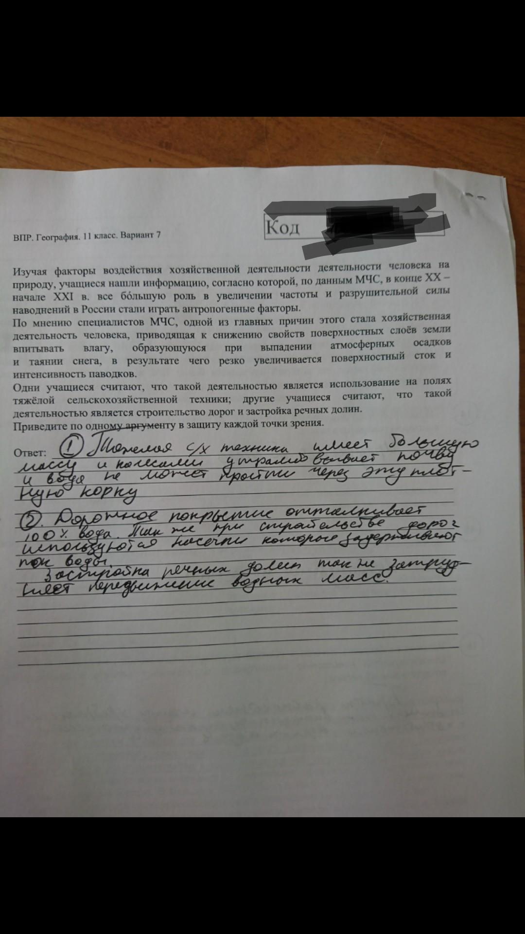 Изучая факторы воздействия хозяйственной деятельности деятельности человека на природу, учащиеся нашли информацию, согласно которой, по данным МЧС, в конце ХХ – начале XXI в. все бóльшую роль в увеличении частоты и разрушительной силы наводнений в России стали играть антропогенные факторы. По мнению специалистов МЧС, одной из главных причин этого стала хозяйственная деятельность человека, приводящая к снижению свойств поверхностных слоёв земли впитывать влагу, образующуюся при выпадении атмосферных осадков и таянии снега, в результате чего резко увеличивается поверхностный сток и интенсивность паводков. Одни учащиеся считают, что такой деятельностью является использование на полях тяжёлой сельскохозяйственной техники; другие учащиеся считают, что такой деятельностью является строительство дорог и застройка речных долин. Приведите по одному аргументу в защиту каждой точки зрения.
