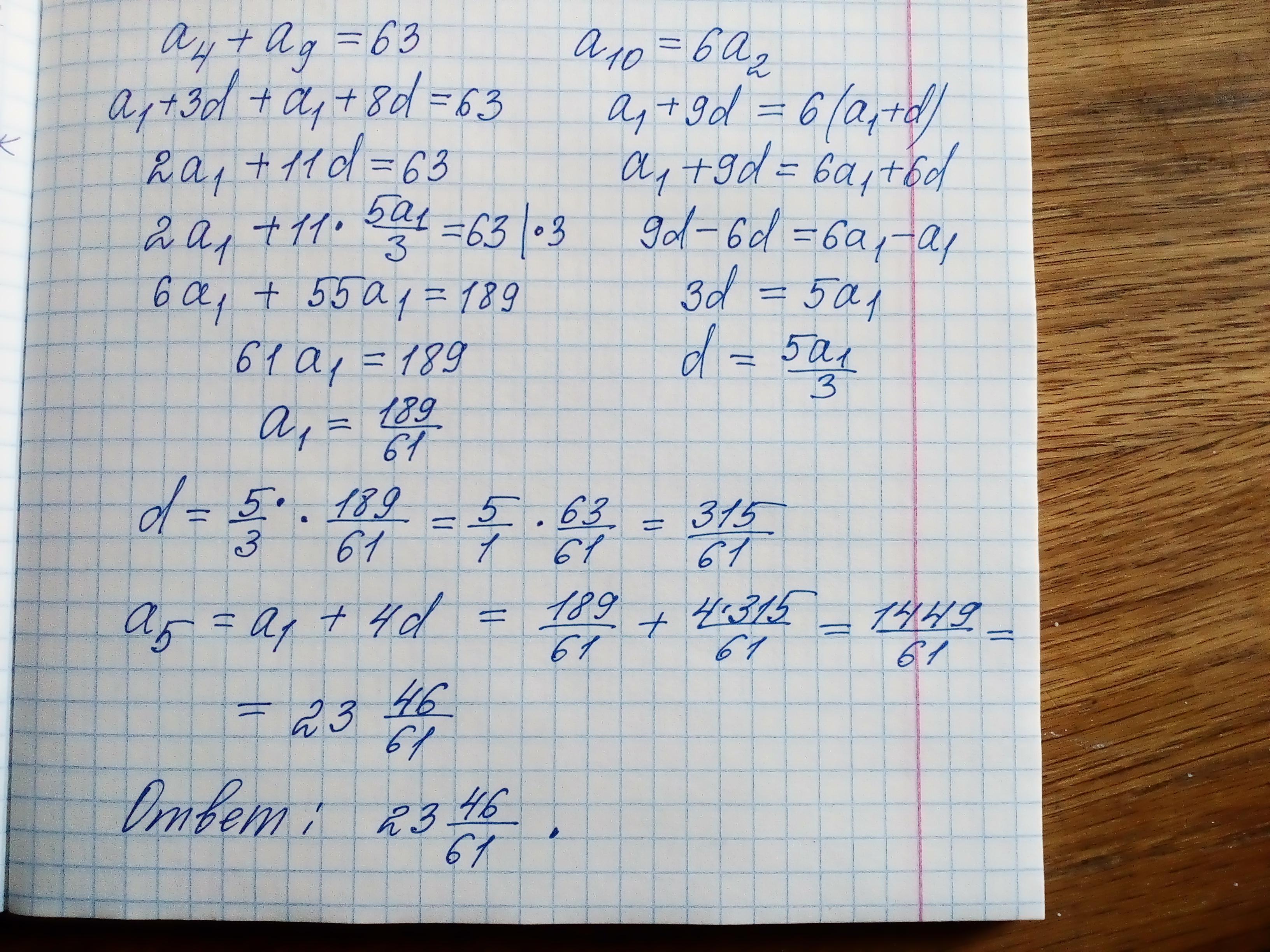 Сумма 4-го и 9-го членов арифметической прогрессии равна 63 а 10-й член в 6 раз больше 2-го . Найдите 5-й член прогрессии