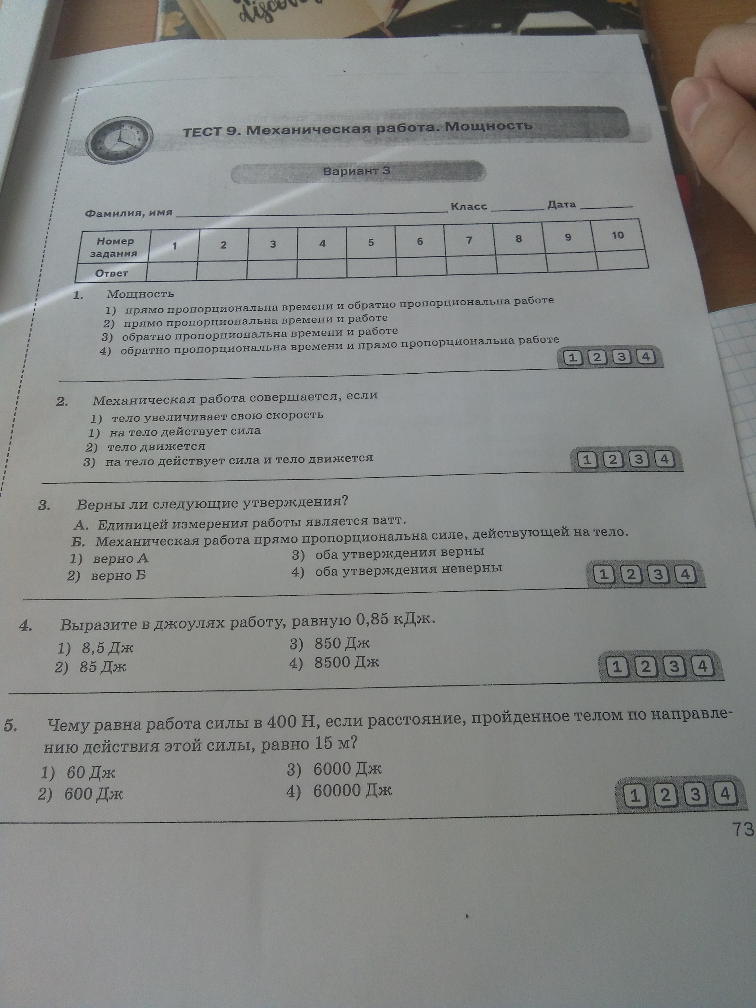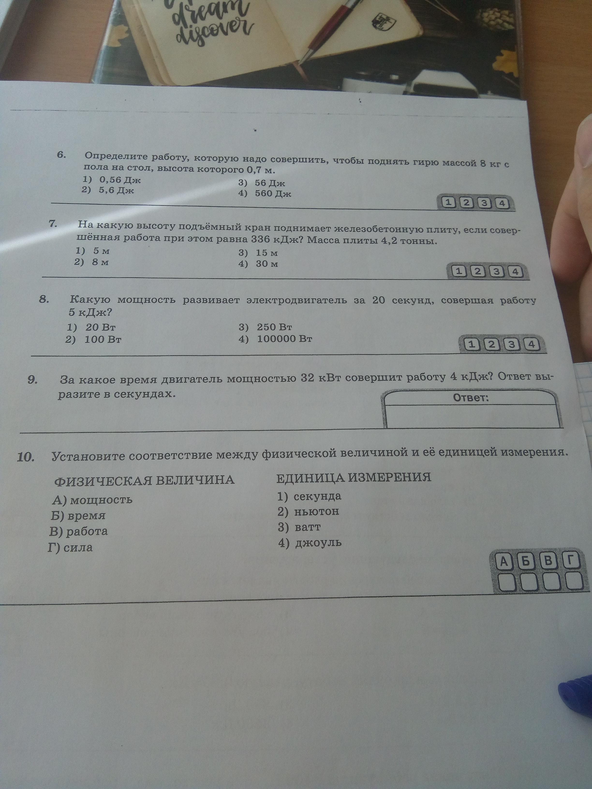 1-2 2-3 3-2 4-3 5) A=F*S=400*15=6000 Дж 6) A=m*g*h=8*10*0,7=56 Дж 7) h=A/m*g=336000/4200=8 м 8) N=A/t 5000/20=250 Вт 9) t=A/N=4000/32000=0,125 c 10 А-3 Б-1 В-4 Г-2