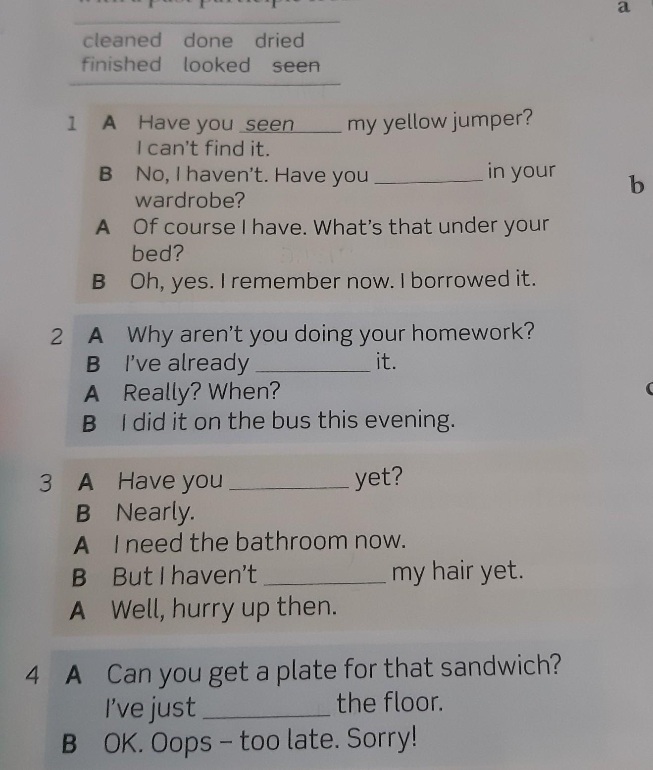 Прости, не заметил слова наверху - 1B- looked, 2B - done, 3A- finished, B- dryed, 4A- cleaned.