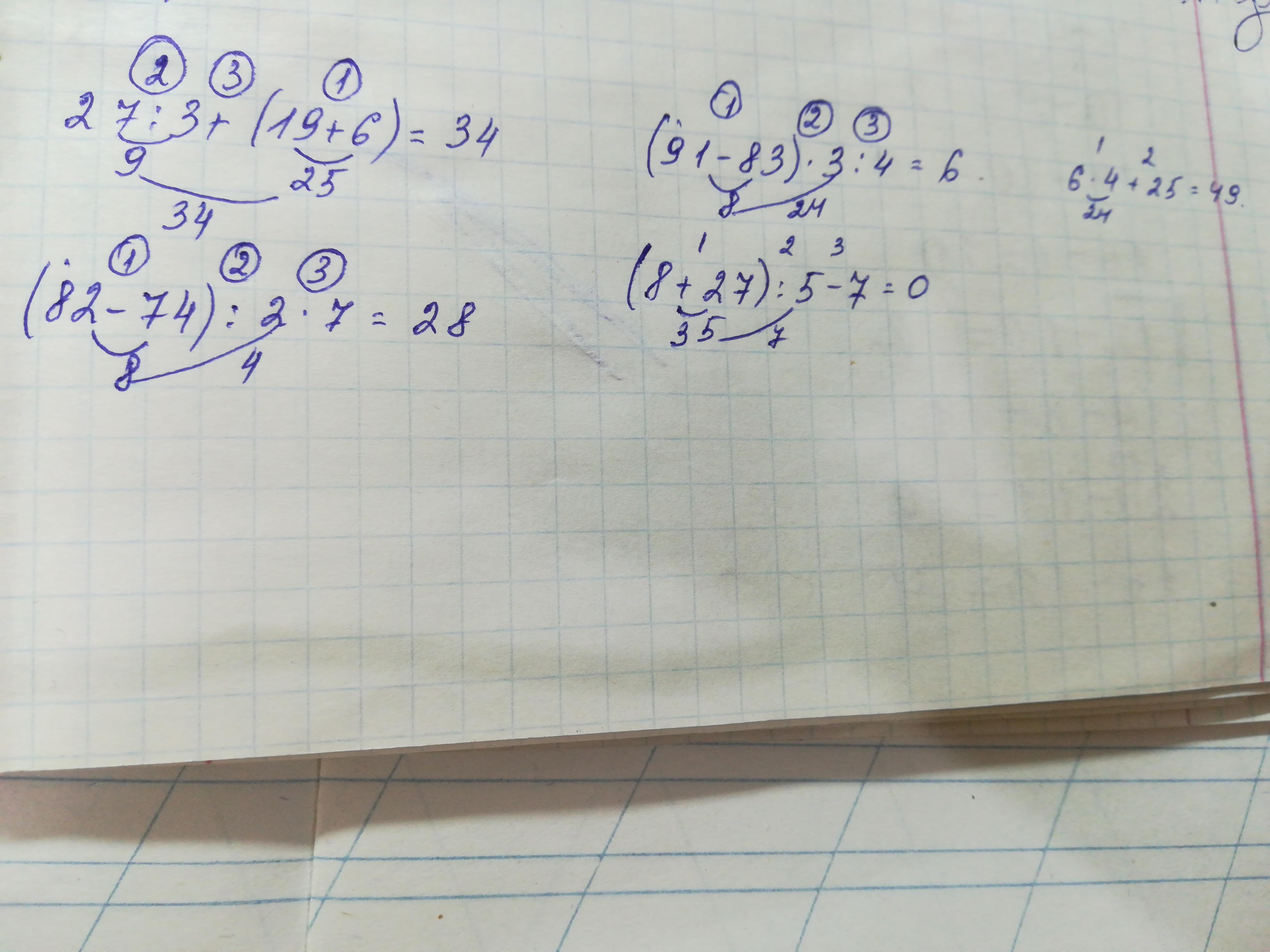 27÷3+(19+6)=9+25=34