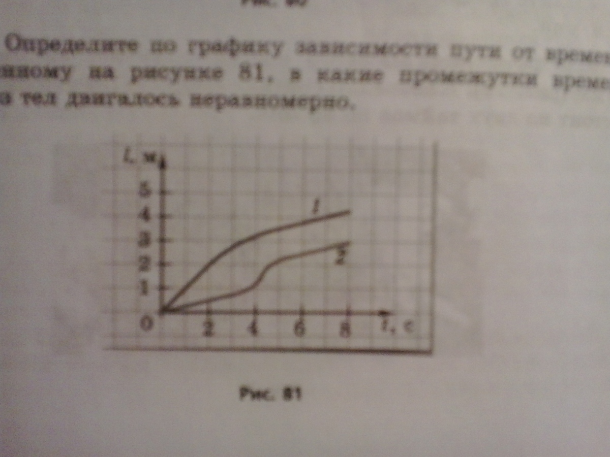 Определите по графику зависсимости пути от времени, изображенному на рисунке 81, в какие промежутки времени каждое из тел двигалось неравномерно.