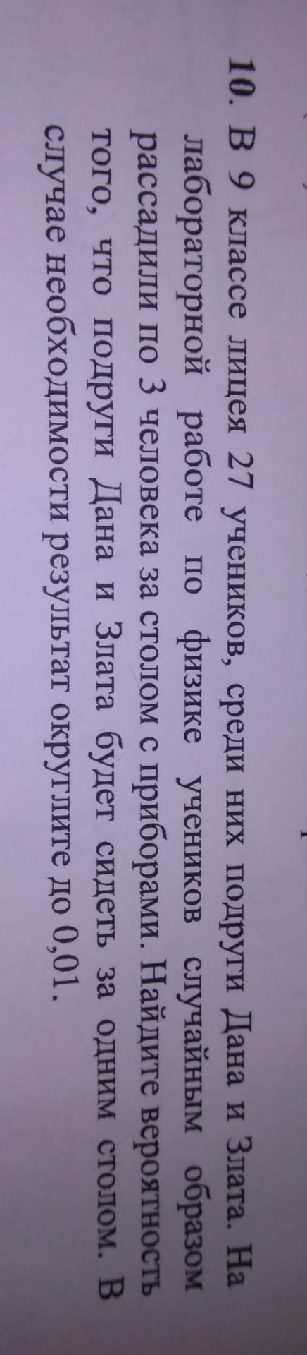 2) Дана может оказаться за любым из столов, значит, оказаться с ней для Златы, как и для любого другого ребенка, есть 2 возможности (2 места осталось за столом) 2/27-1=2/26=0,08 искомая вероятность