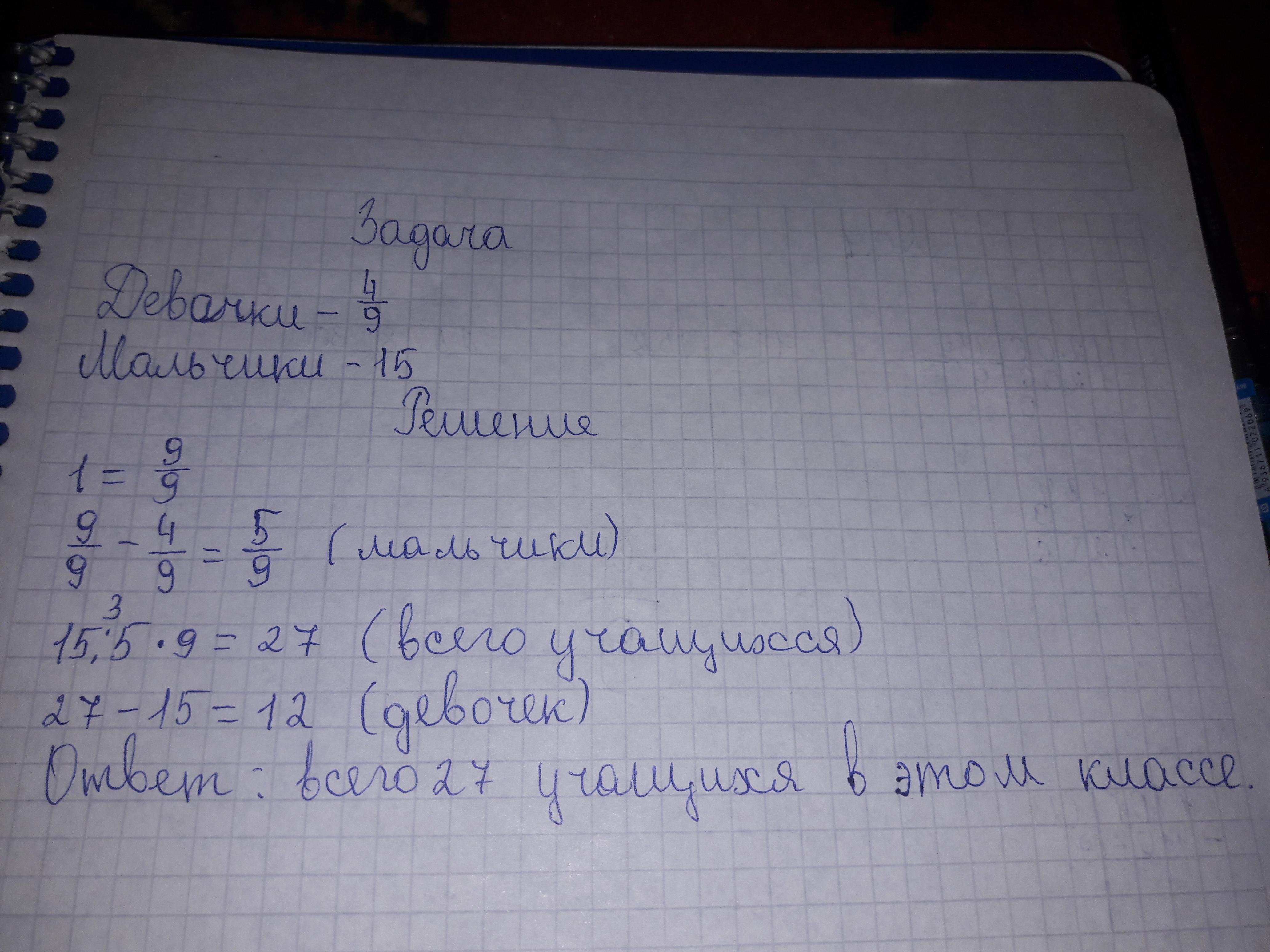 Четыре девятых всех учащихся класса составляют девочки. Сколько всего учащихся в этом классе, если в это классе 15 мальчиков