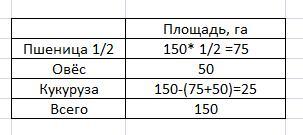 В Фермерском хозяйстве площадь посевного поля равна 150 га .Одна вторая часть его занята пшеницей ,50га -овсом ,а остольная часть -кукурузой .Какая площадь занята пшеницай ? Какая площадь занята кукурузой? Используя данные этой задачи , заполни таблицу . Помогите правельно составить таблицу.