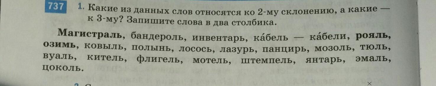 Магистраль 3скл, Бандероль 3скл, Инвентарь 2скл, Кабель 2скл,Кабели нет склонения, Рояль 2скл, Озим 2скл, ковыль 2скл, полынь 3скл, лосось 2скл, лазурь 3скл, панцирь 2скл, мозоль 3скл, тюль 2скл, вуаль 3скл, китель 2скл, флигель 2скл, мотель 2скл, штемпель 2скл, янтарь 2скл, эмаль 3скл, цоколь 2скл